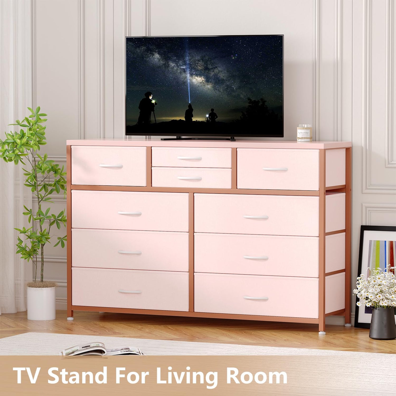 Jojoka Wide 10 Drawer Dresser,TV Stand Entertainment Center Fabric Storage Dressers Drawers for Bedroom, Hallway, Nursery, Closets, Steel Frame, Wood Top (Pink)