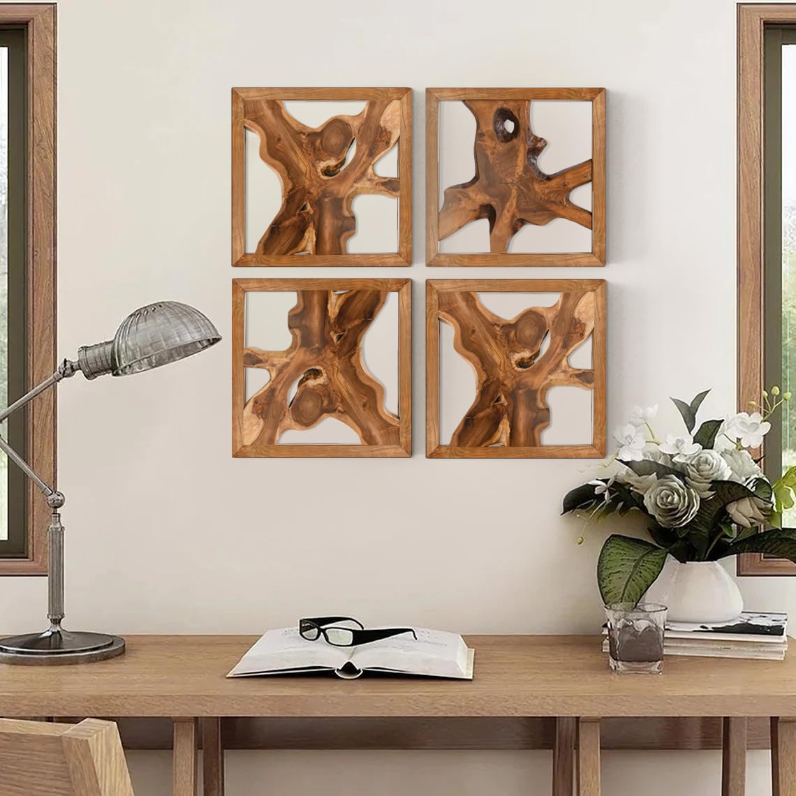 JOLLYMER Live Edge Teak Wood Wall Decor, Rustic Wooden Wall Art, Handcrafted Home Decoration for Living Room Bedroom Office, 17"x17" Natural Frame