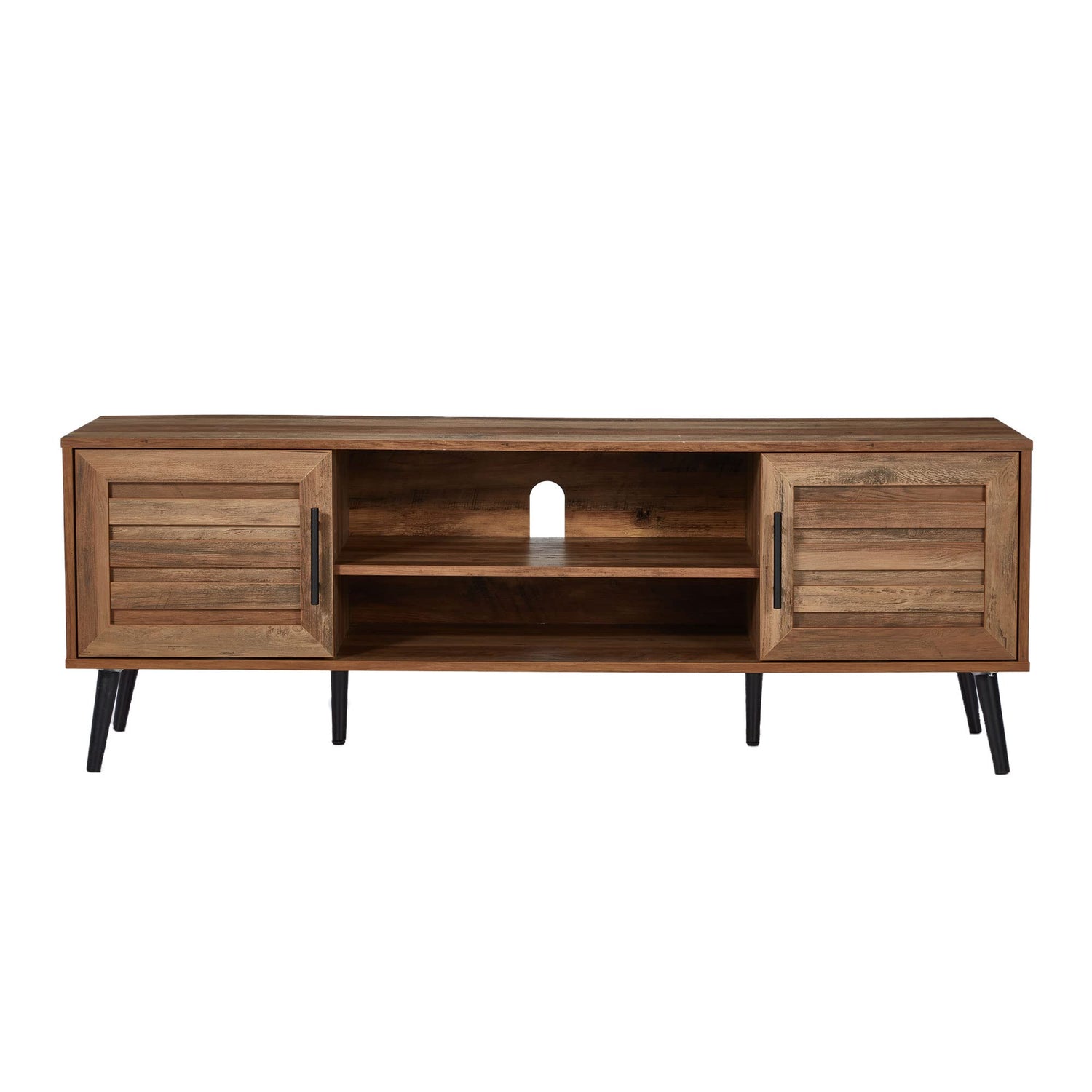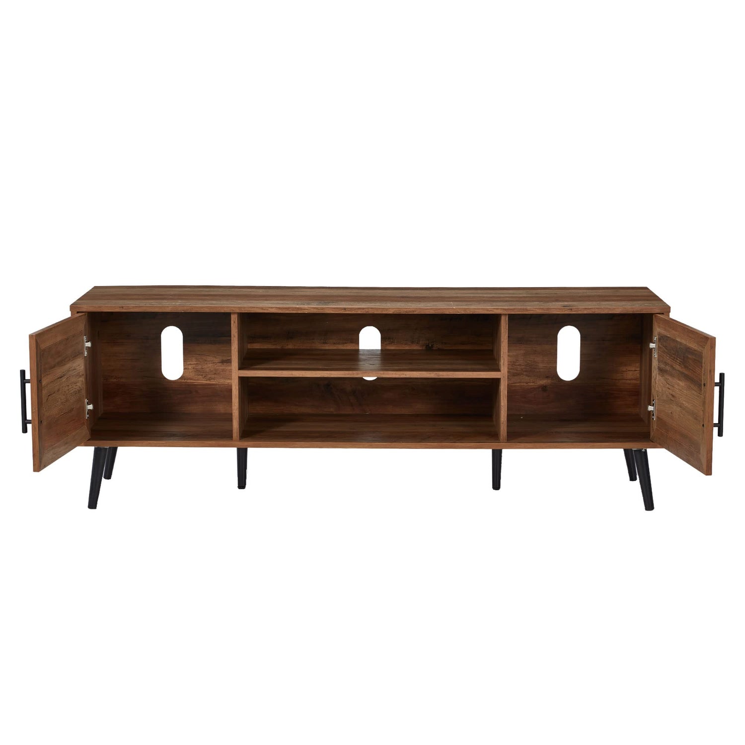 Details: Display your tv or home decor with this Mid Century Modern Wooden TV Entertainment Console from Jomeed. This retro TV console is ideal for displaying televisions, home decor, books, plants, and more and is versatile enough to fit in with almost any home decor style. Cabinets feature door pulls and helps you keep remote controls, DVDs, and other media items out of sight to help you keep your home looking neat and tidy. Additionally, middle open shelving allows you to store decor, cable boxes, gaming consoles, picture frames, and more and has a cut-out hole to thread cables to keep them out of sight. Tall table legs keep this console up off the floor, giving you enough room to easily clean under the console. This entertainment console is ideal for use with televisions up to 65 inches diagonally, or 150 pounds. Add extra storage to your living space with the Mid Century Modern Wooden TV Entertainment Console from Jomeed.