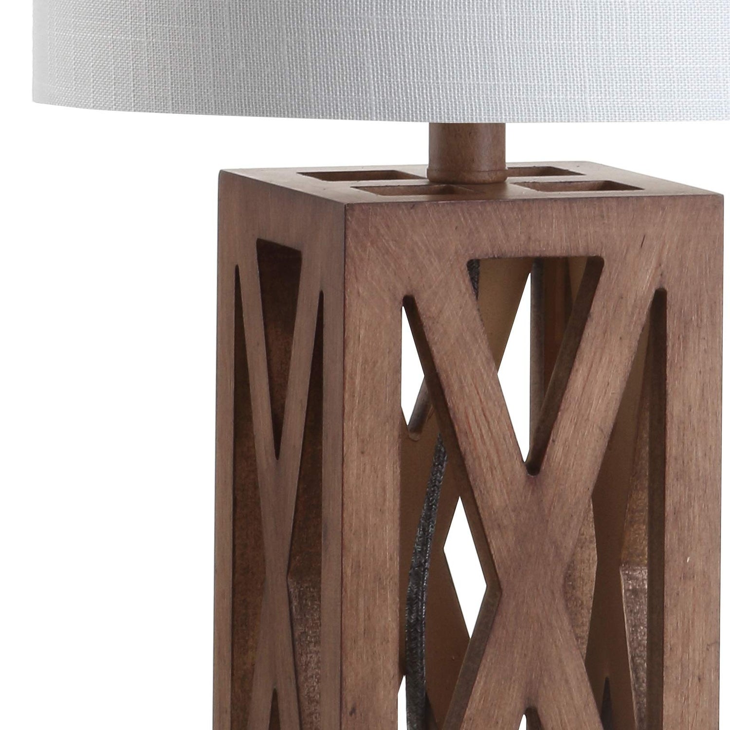 Details: This gorgeous wooden lamp has an earthy texture and a geometric open structure that would easily blend with traditional, rustic, or contemporary décor. Designers love the silk-wrapped cord, linen drum shade, and wooden finial. At 21. 5" high, it would sit perfectly atop a desk, armoire, or side table.