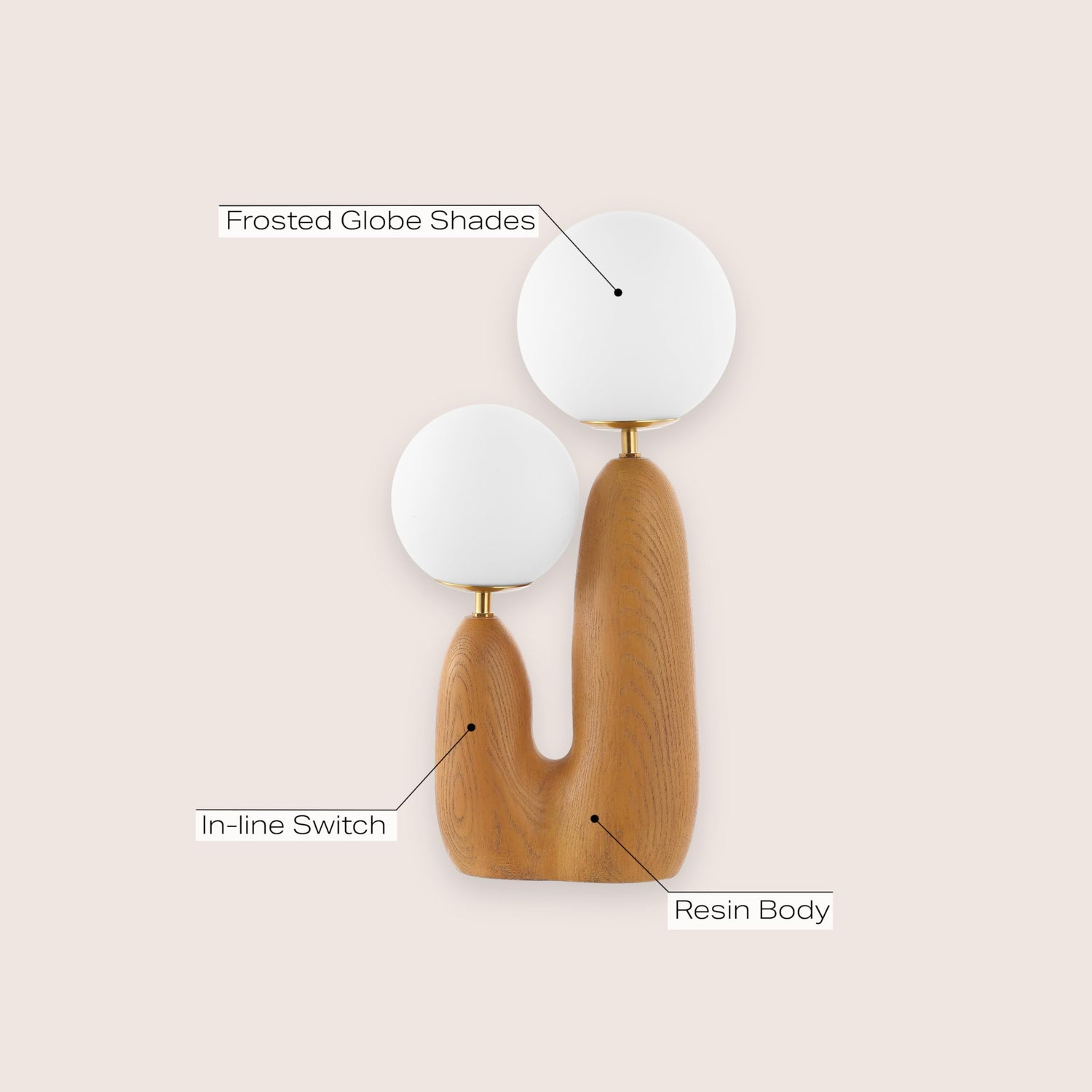 Details: The wood-look design of this minimalist lamp has a mid-century modern Danish vibe. Inspired by Nordic style, this 2-light lamp is a chic addition to any living room, bedroom, or office. Frosted globes soften the bright LED bulbs to provide soft ambient light.
