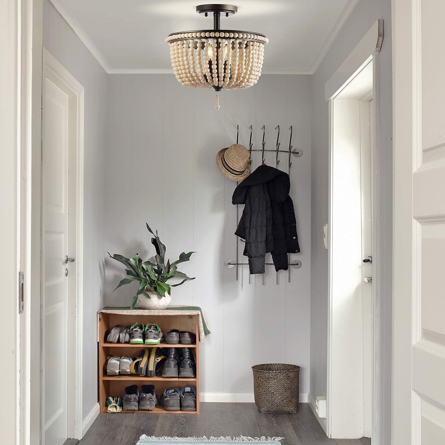 Details: Wood beads and black metal details add a laidback look to any room with this semi flush mount. In a neutral color scheme, the designers of this piece allow the unique silhouette and beading detail to make a statement. Gorgeous in a nursery or dining nook, the casual elegance of this design is sure to shine in any space.