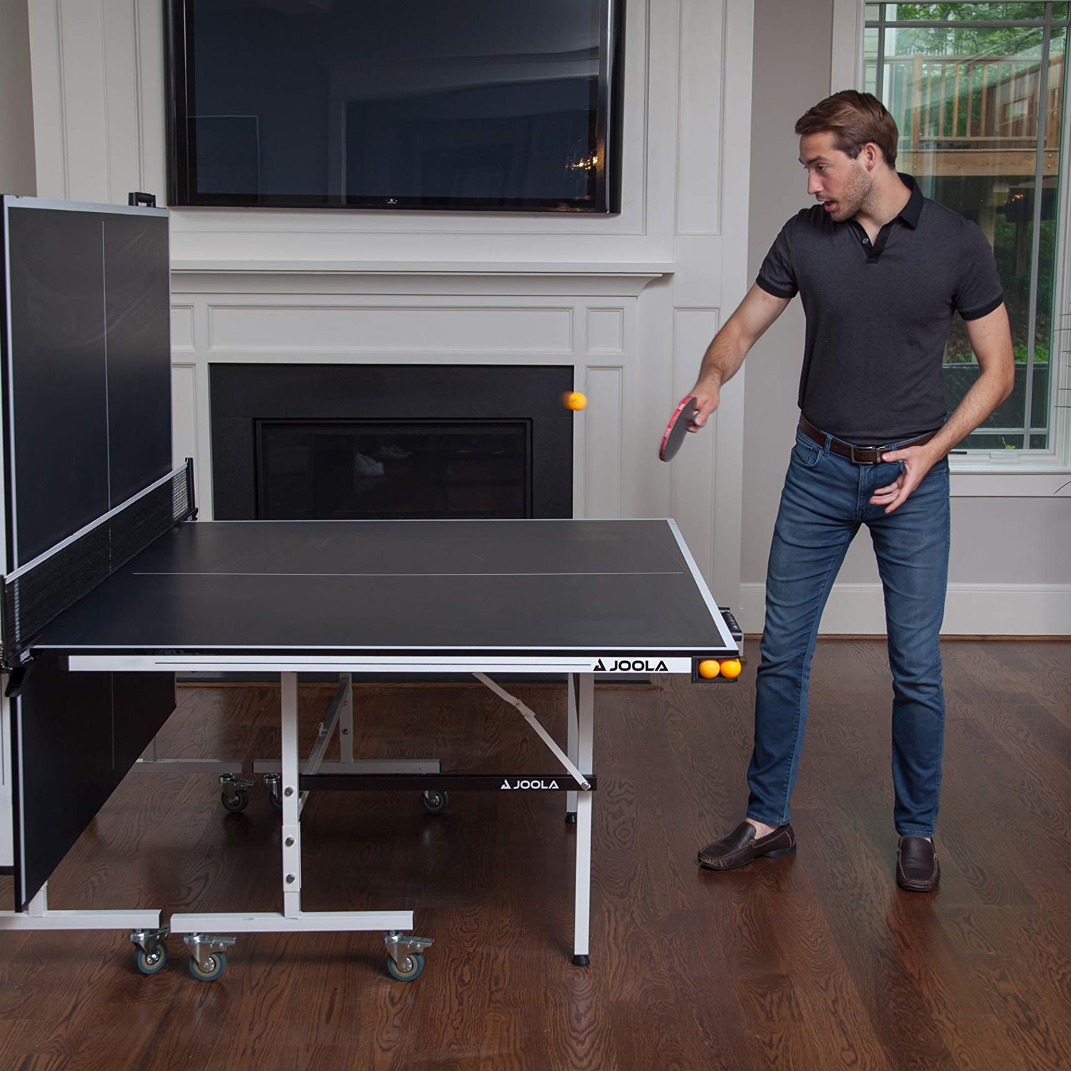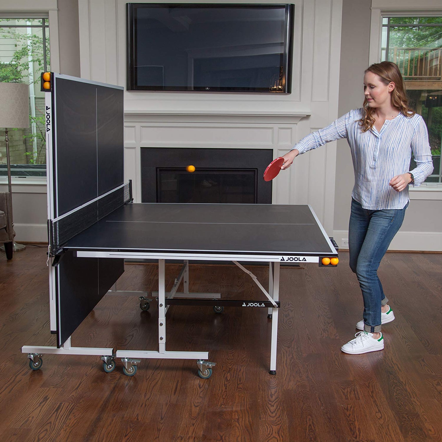 - CORNER BALL HOLDERS AND ABACUS SCORER: In addition to the sleek, black top, the table features four ball holders and two magnetic abacus scorers making it a great, stylish addition to any home. Each ball holder holds 3 40mm JOOLA table tennis balls.