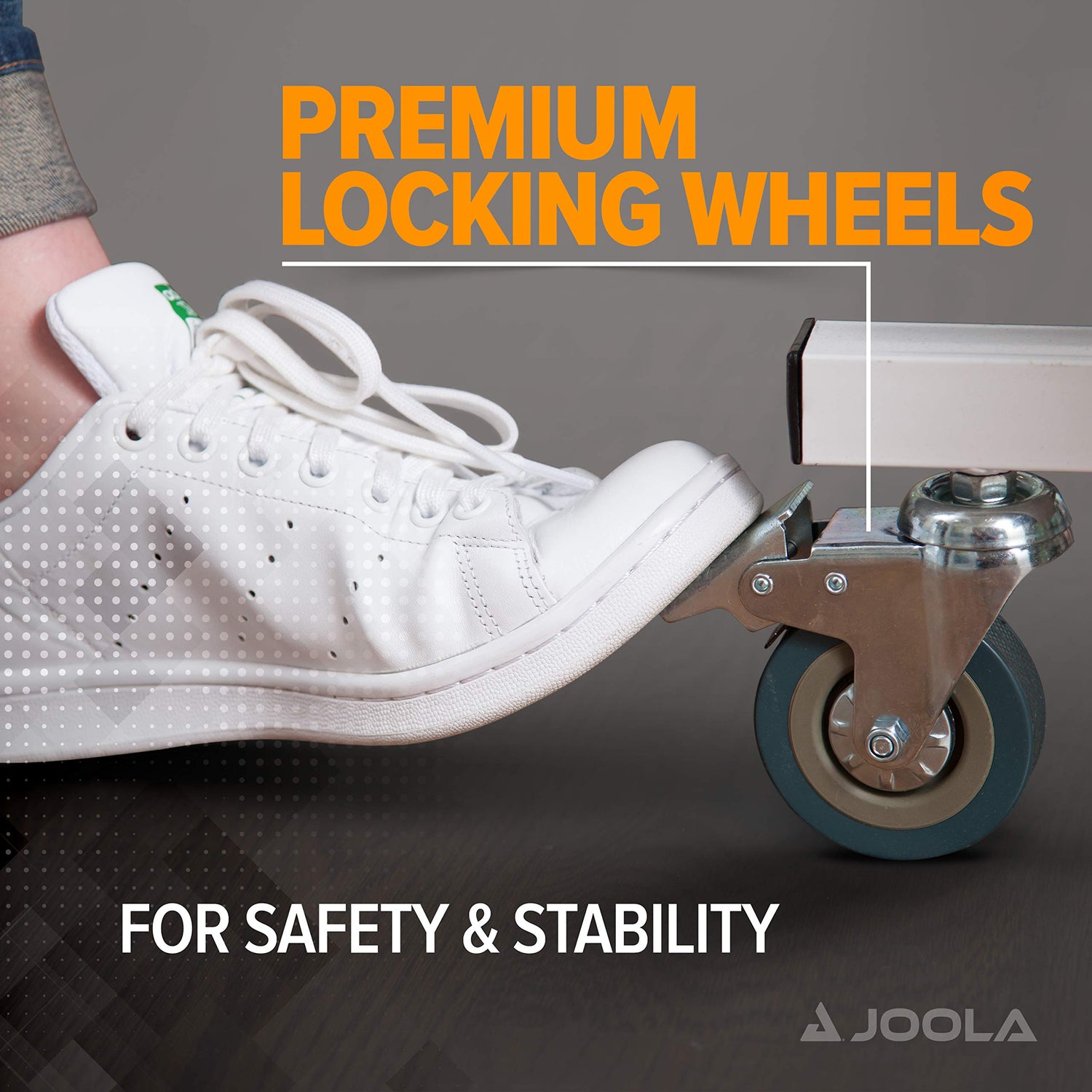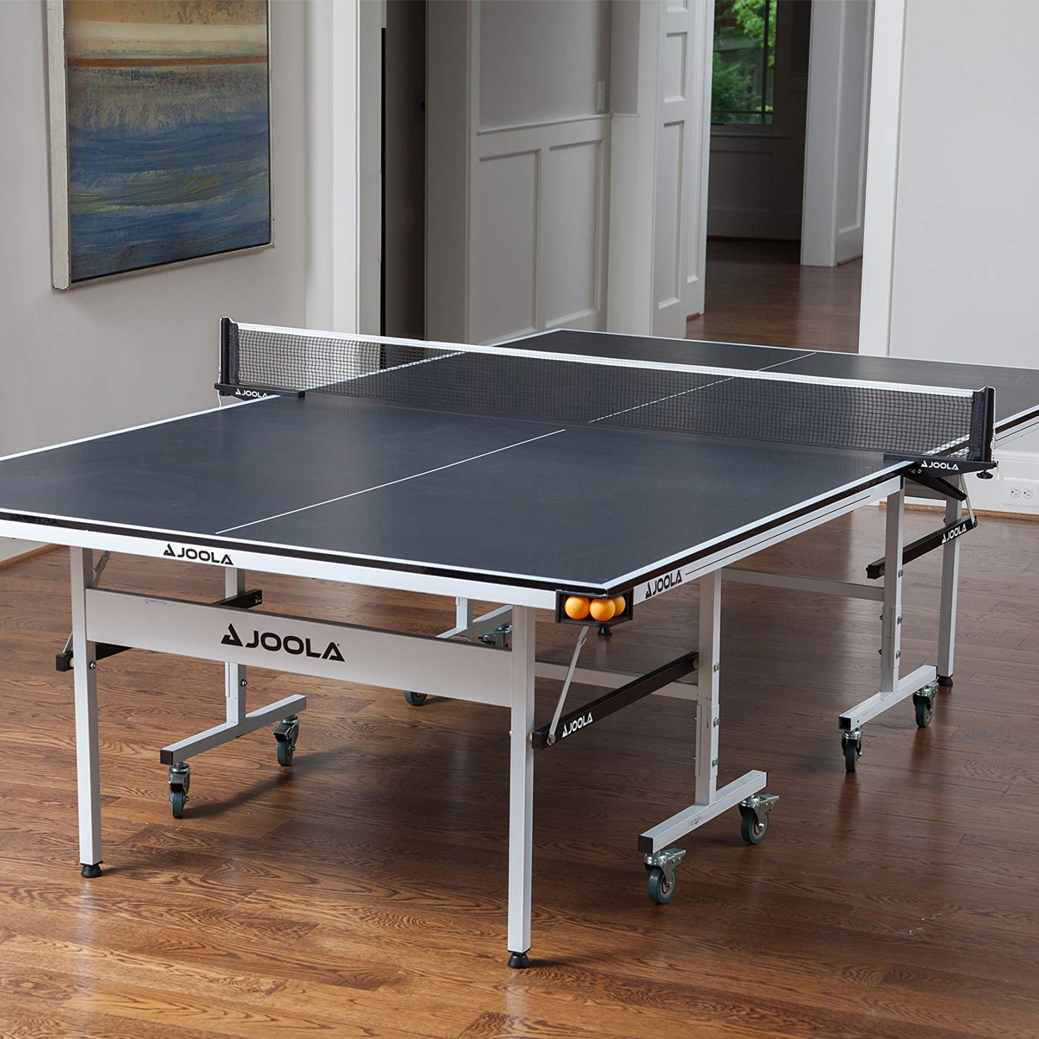 Details: The JOOLA Rally TL Table Tennis Table is the perfect table for anyone looking for a fun-filled game of ping pong with some added style. This ping pong table is sure to become a centerpiece in your office or home with its unique black charcoal top, corner ball holders and magnetic abacus scorers. Each corner can hold up to 3 40mm ping pong balls and the two included magnetic abacuses attach to the side of the table. This awesome table tennis table comes 95% pre-assembled and is ready to play in just 10 minutes! A sleek frame and separable nesting halves make this table perfect for compact storage. The professional-grade MDF (medium density fiberboard) surface creates a consistent ball bounce and durability. Additionally, the 1.2 inch apron and 1.2 inch diameter sturdy steel legs are used to create a durable table that lasts for years. The ping pong table legs feature adjustable height levelers to ensure a level playing surface and 3-inch locking caster wheels for added stability. The JOOLA Rally TL Table Tennis Table features dual safety anti-tilting locking devices to ensure safety when the table is in both playing and storage positions. Simply fold one of the table halves and you can play solo with single player playback mode! The included ping pong net and post set features a simple, removable clamp post and an adjustable net tension system. The JOOLA Rally TL Table Tennis Table and Ping Pong Net Set are USATT approved. Start playing like a champion with equipment developed for champions! JOOLA is a proud sponsor of the US Open and the US National Team. Durable 1.5 inch resin apron