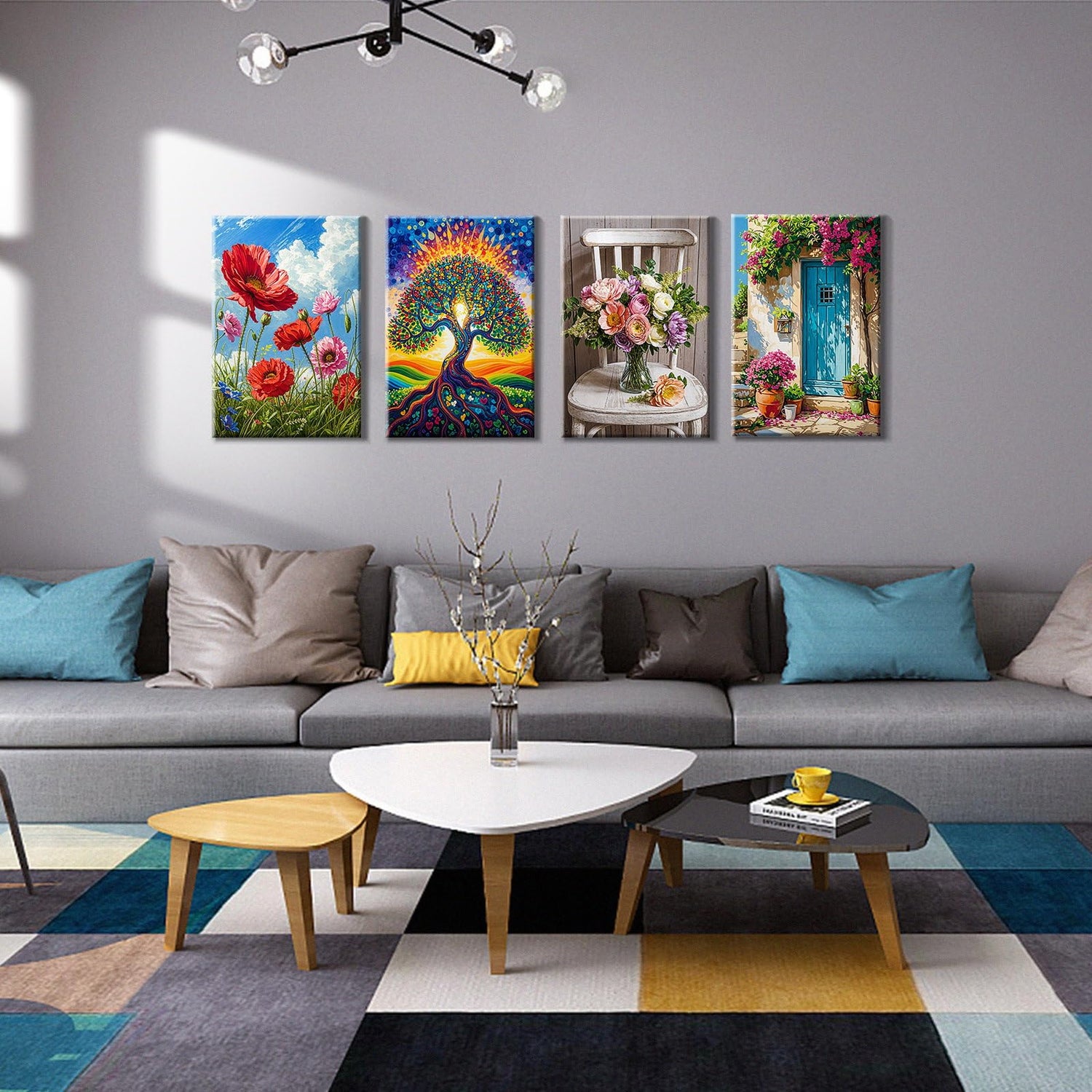 JOOZ 4 Pack Framed Paint by Numbers Kit for Adults, Flowers Paint by Number with Easel, DIY Tree of Life Adult Paint by Number Kits on Canvas Framed, Floral Oil Painting Kit for Home Decor 8x12 Inch