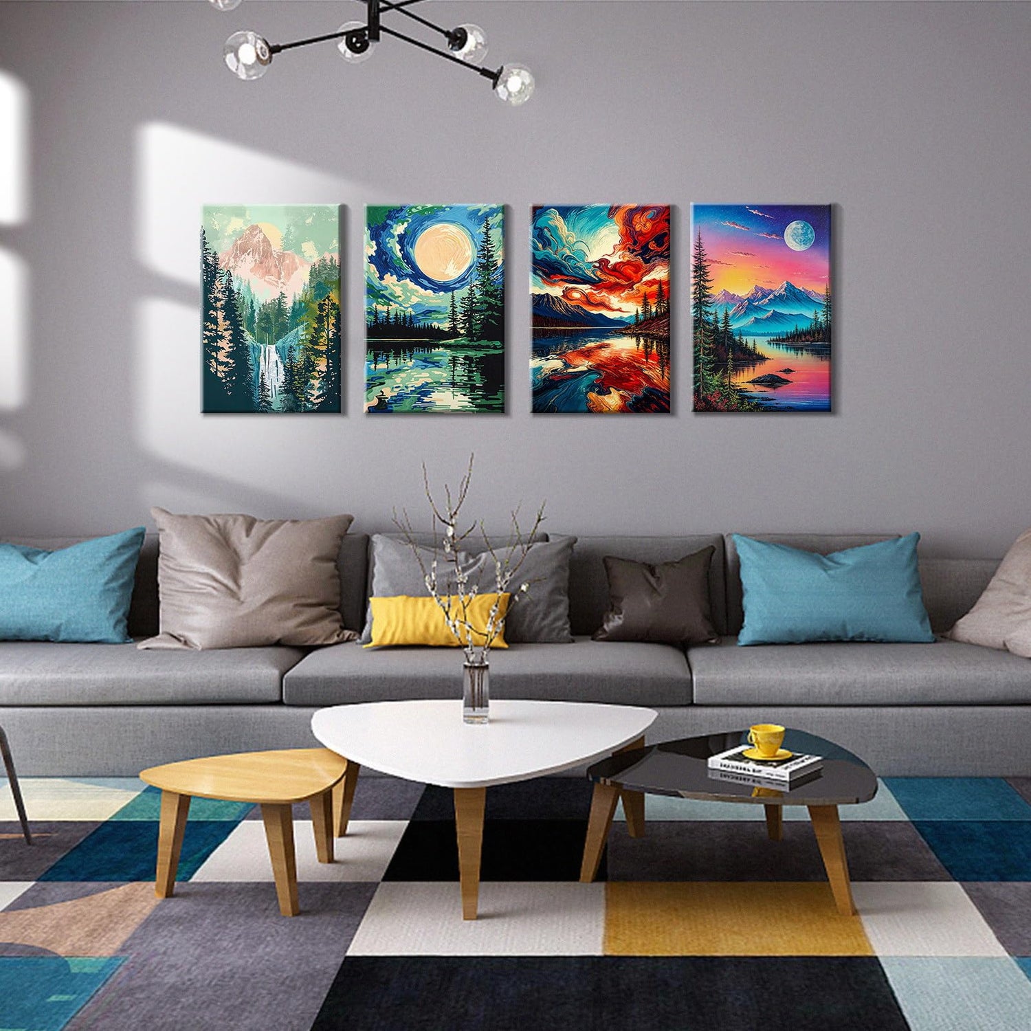 JOOZ 4 Pack Paint by Numbers Kit for Adults with Frame, Moon Paint by Number with Easel, DIY Mountain Lake Adult Paint by Number Kits on Canvas, Landscape Oil Painting Kit for Home Decor 8x12 Inch