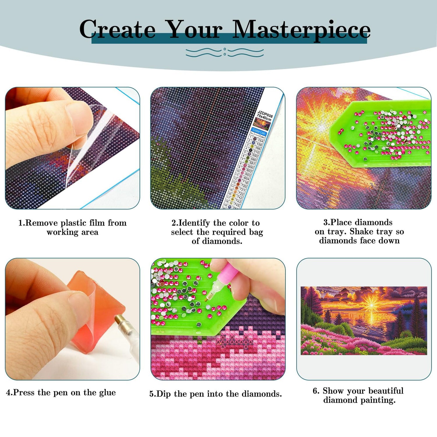 - [ LARGE DIAMOND ART KITS FOR ADULTS ] --- This large diamond art kits includes a range of tools to help you easily start diamond art dotting. It includes a high-definition canvas measuring 27.5*15.7 inch with clear and intricate patterns. The kit also provides two diamond pens, two trays for convenient diamond storage, and two pieces of clay for securing the diamonds in place. The kit comes with a sufficient quantity of diamonds, so you don't have to worry about running out of materials.
