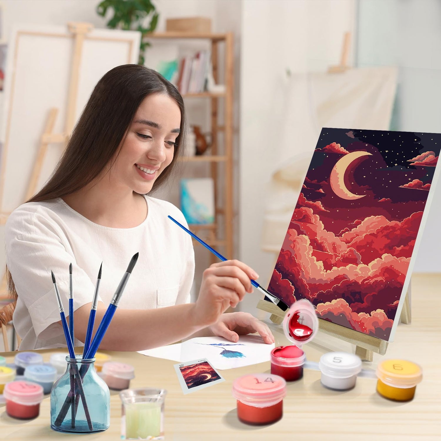 - [ Paint by Numbers Kit ]: This paint by numbers kit for adults has a complete tool includes a 8 x 12 inch cotton canvas with wooden frame, adjustable wooden easel, necessary tool accessories, a reference image, 2 different brushes, and a set of acrylic paints.