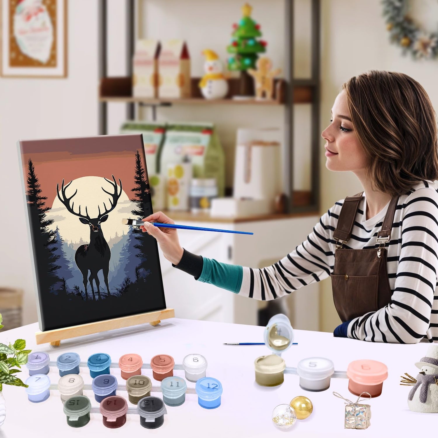 JOOZ Paint by Numbers Kit for Adults Framed Deer Paint by Number with Easel Moon Adult Paint by Number Kits Framed Canvas DIY Forest Oil Painting Kits for Home Wall Decor 8x12 Inch