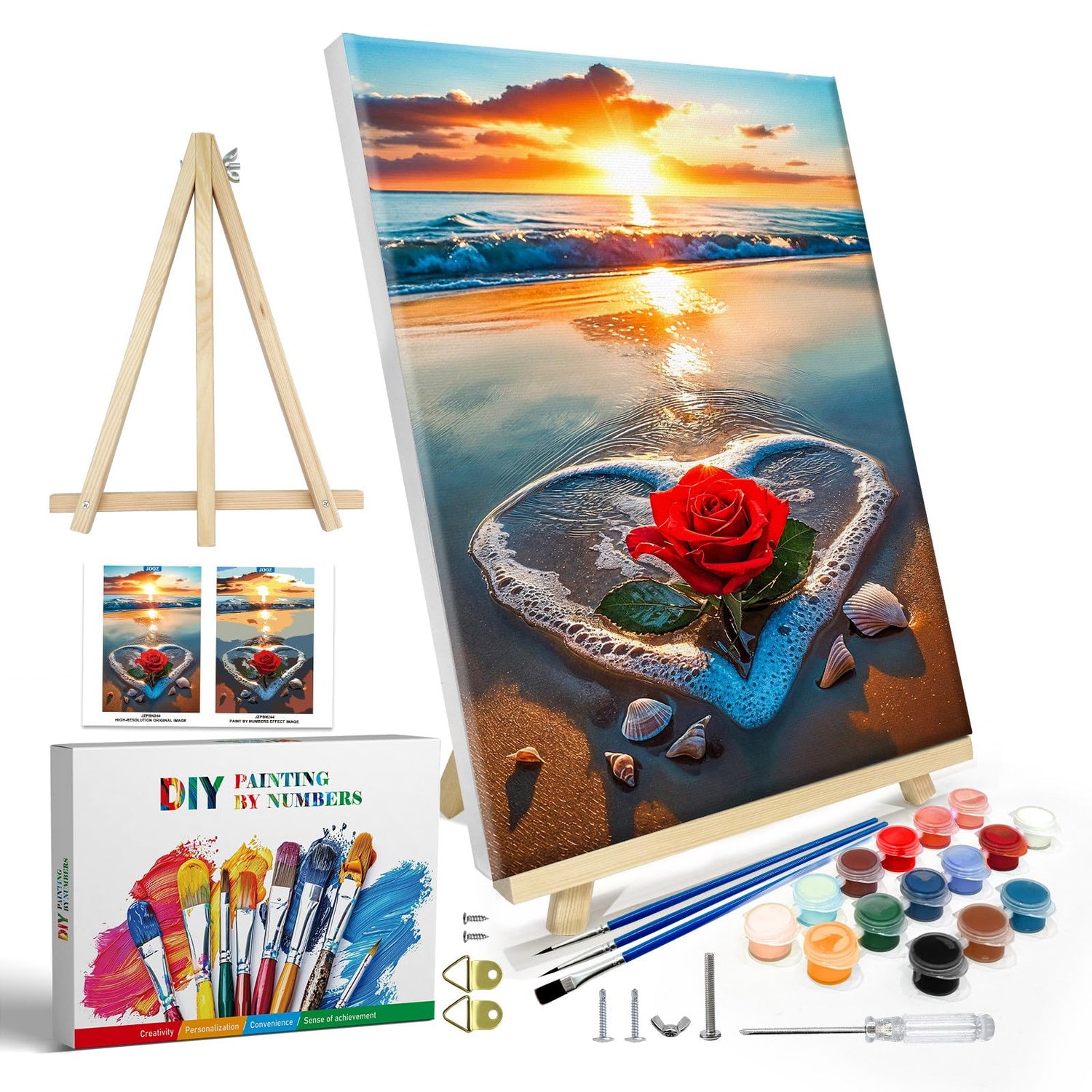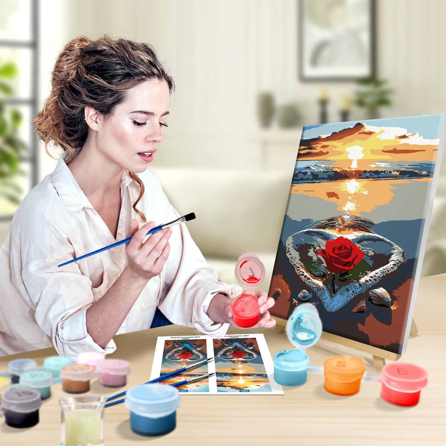 JOOZ Paint by Numbers Kit for Adults with Frame, Beach Sunset Paint by Number with Easel, DIY Beach Rose Oil Painting by Number, Easy Adult Paint by Number Kits on Canvas for Wall Decor 8 x 12 Inch
