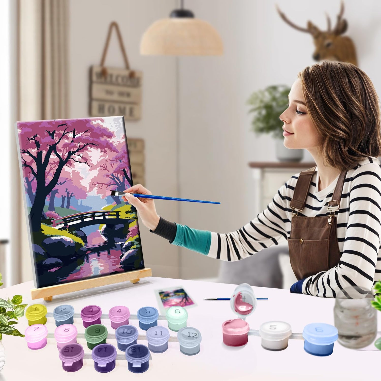 - [ Paint by Numbers Kit for Adults ]: You will receive an 8x12-inch framed linen cotton canvas, a set of high-quality acrylic paint (vacuum-sealed to ensure freshness), a reference image, two brushes, an exquisite packaging box, an easel, and a tool kit.