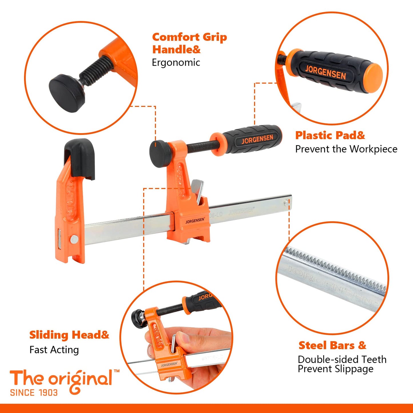 • Quick-Adjust Design: The multiple-disc clutch design allows the sliding head to hold security at any position along the bar clamp. And the fast-acting sliding head is threaded design, making the sliding head fixed firmly at any point on the rod.