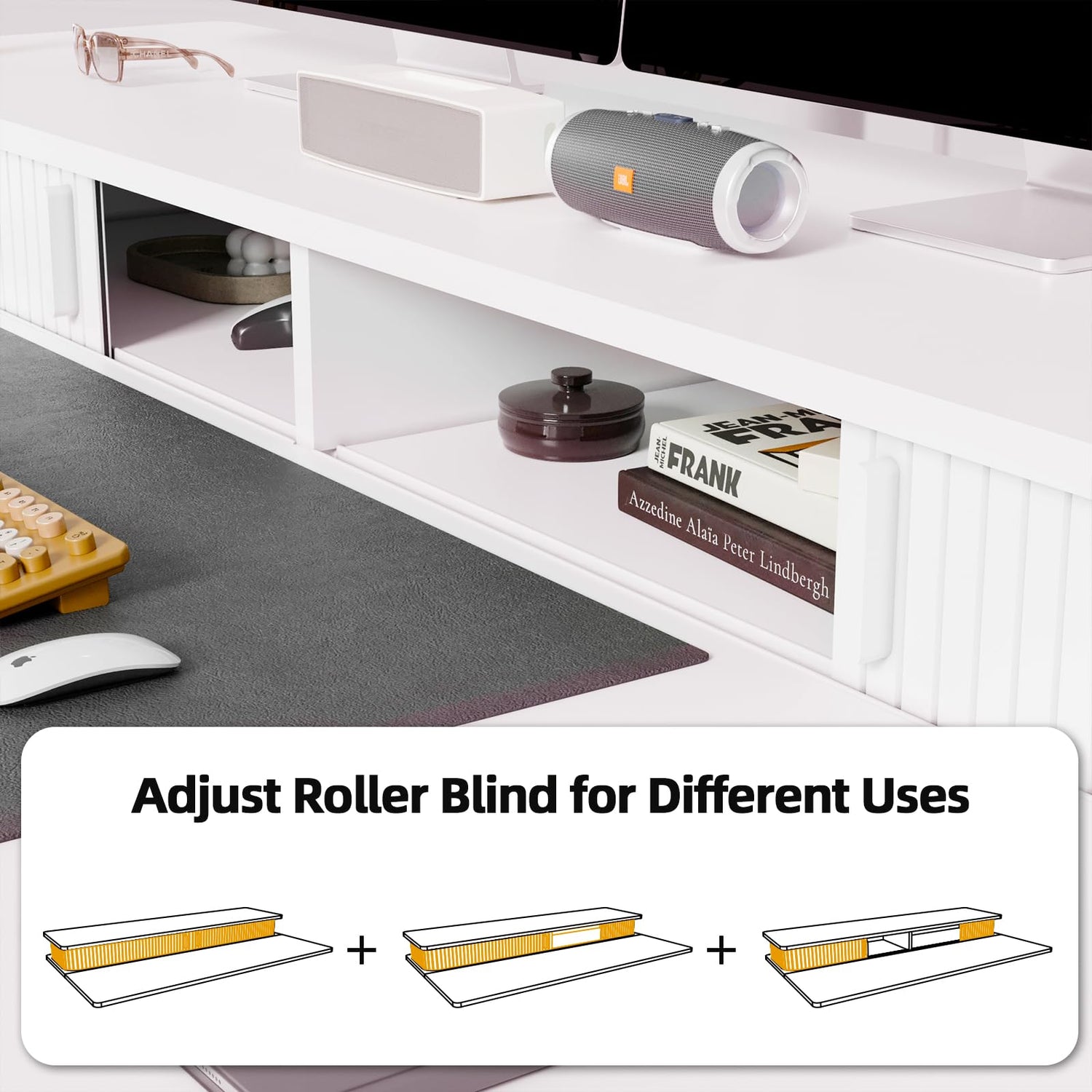 - Storage Shelves with Sliding Doors: Unique electric stand up desk with roller shutter door design. Provides 2 hidden storage spaces (3.5"H x 20.1"W x8.9"D) to keep your desktop clean and tidy