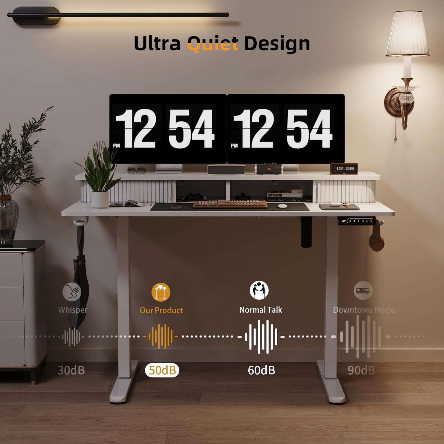 Details: JOY worker Height Adjustable Electric Standing Desk with Storage Shelves, 48 Inch Table with Built-in Monitor Stand, Sit Stand Desk with 2 Hooks, white desktop and white frame