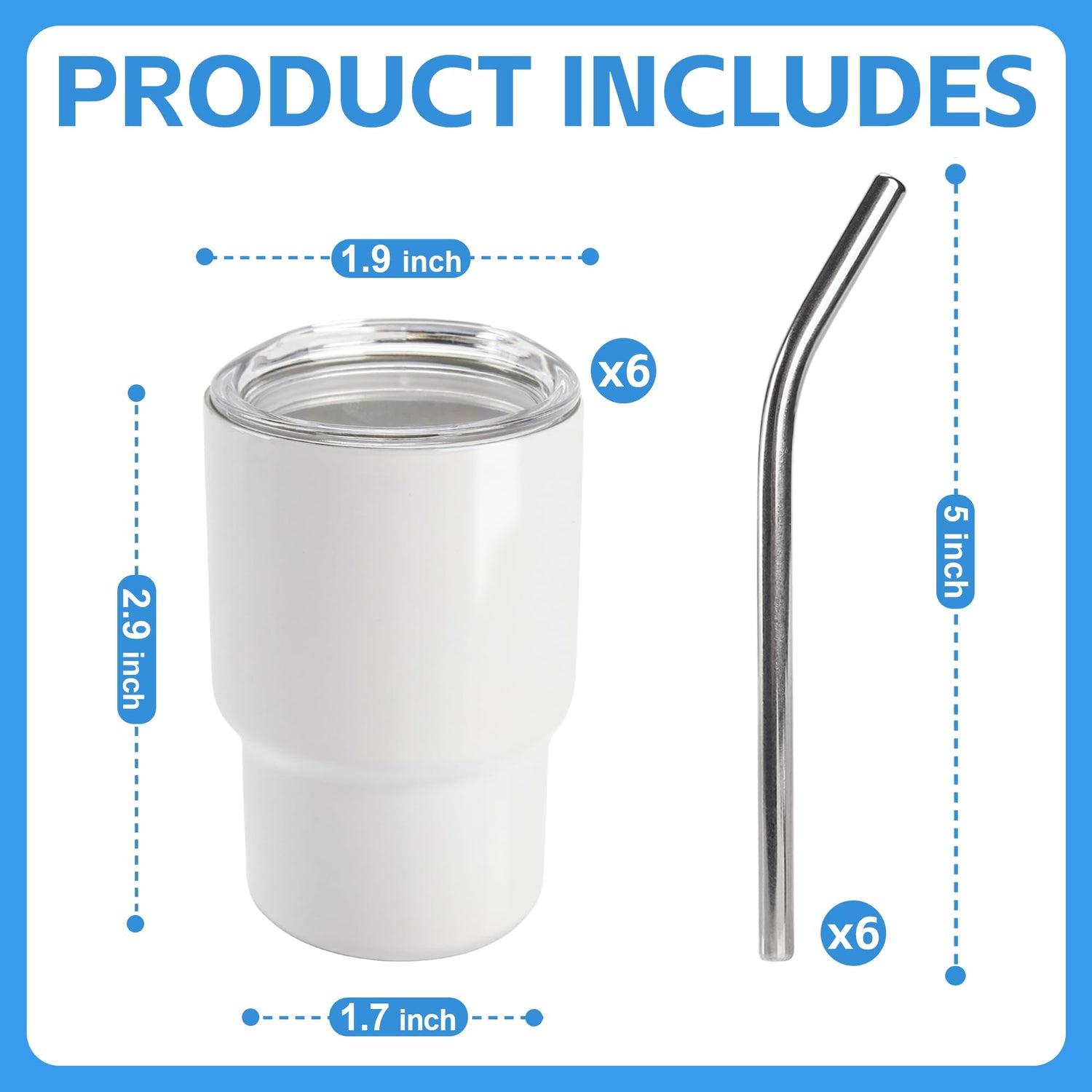 Joyclub 3 oz Mini Tumbler Shot Glass with Straw and Lid 6 Pack White Mini Cup Stainless Steel Sublimation Shot Tumblers for Wedding Party Whiskey Favors