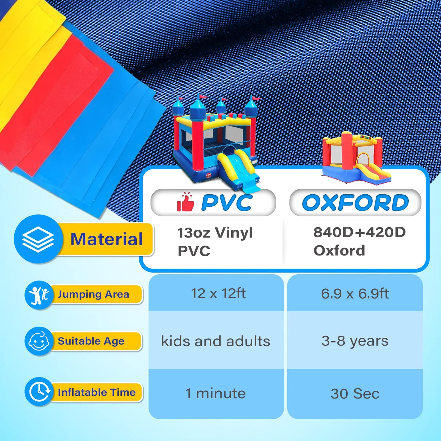 - 【COMMERCIAL GRADE PVC MATERIAL】: Constructed with commercial grade PVC vinyl, it is more durable, stronger and tear resistant than standard nylon residential inflatable bounce houses, and can last longer with frequent use. All high stress areas are made of industrial strength 13 oz) multi-layer PVC with double to quadruple stitching. This includes the bouncing surface, the bottom and the slide surface.