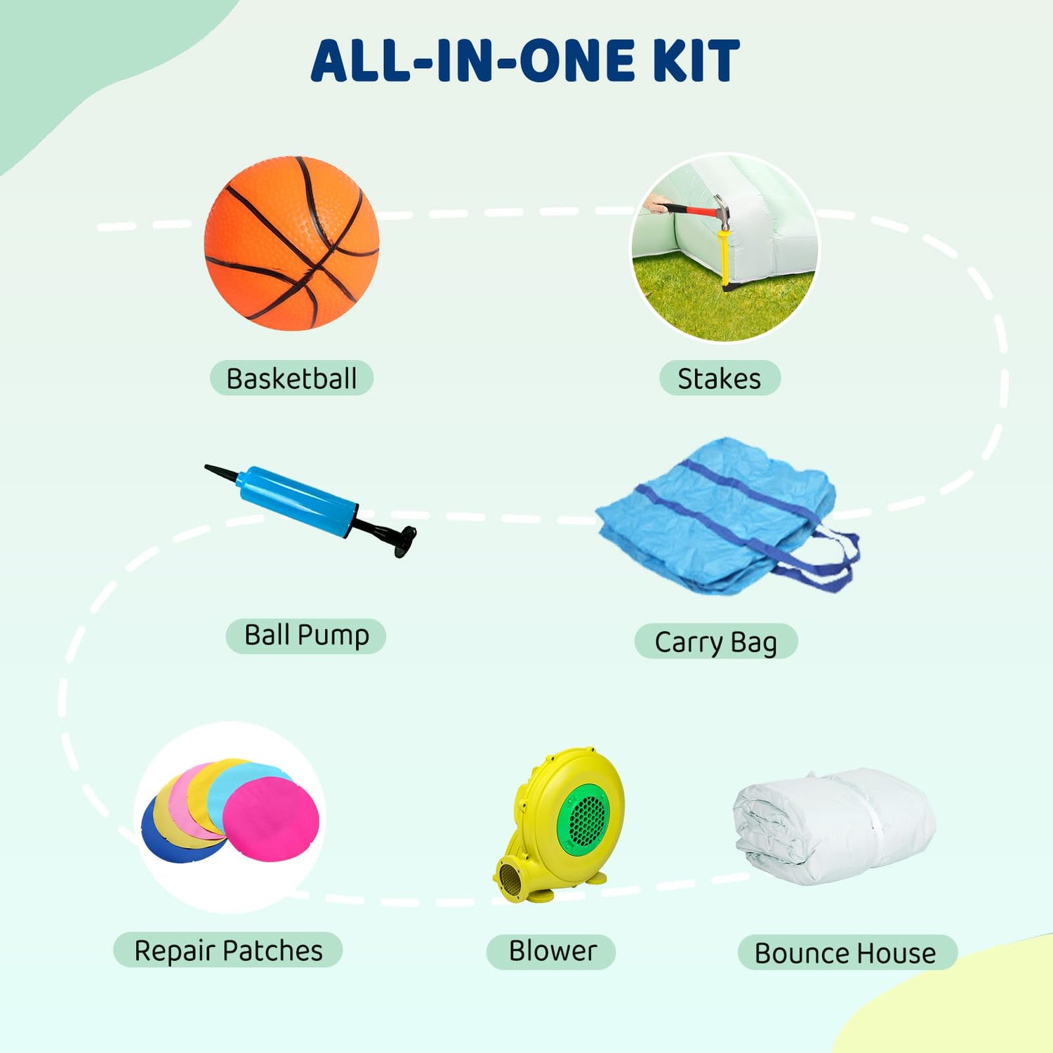 - 【Lots to Fun, More than Bounce】- The bouncing house adds slide and basketball Hoop to make it more fun for kids. The slide and basket included in the design not only exercise their throwing and crawling abilities, but also keep kids away from electronics.