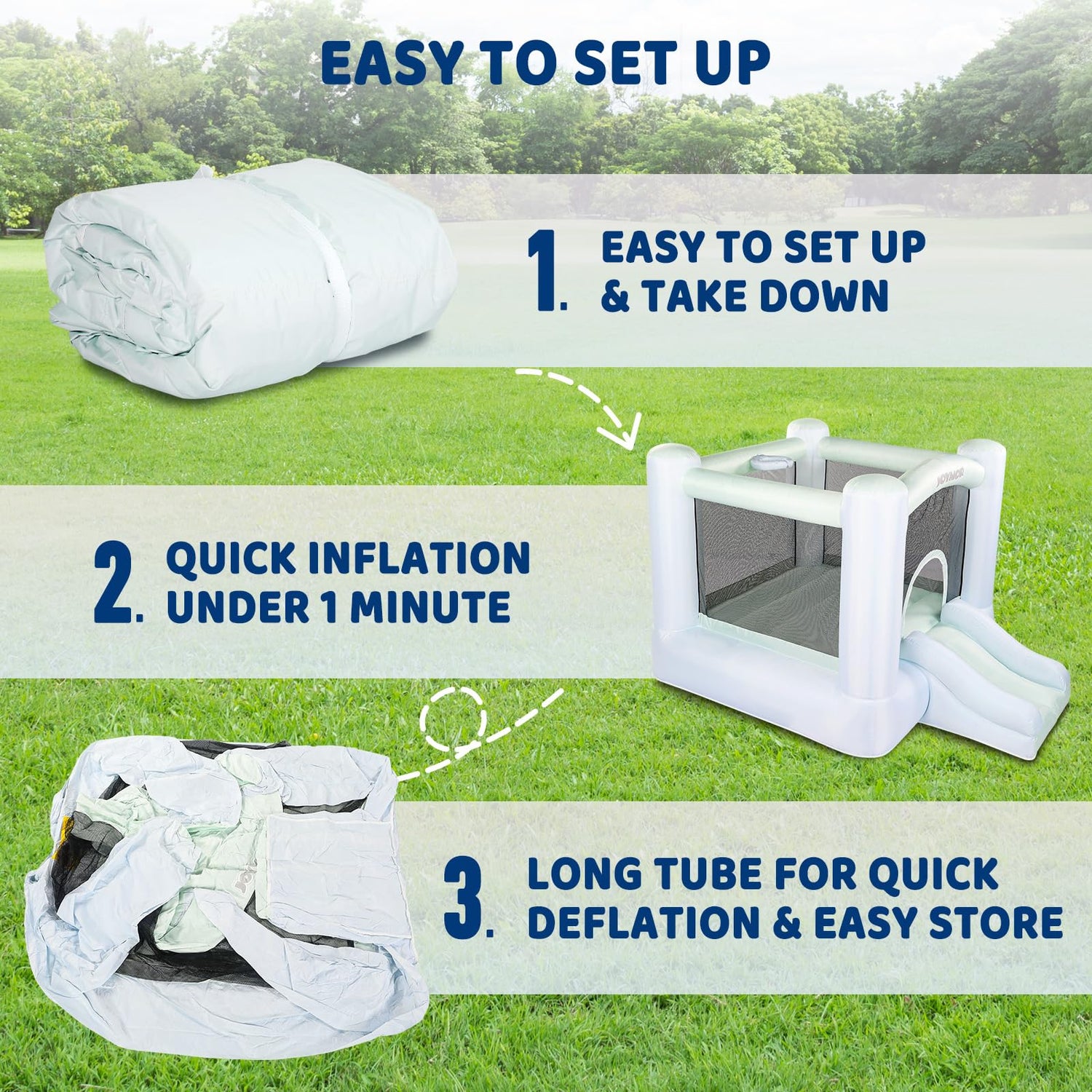 - 【Easy to Set Up&Take Down】- The inflatable bouncy castle just takes less than 1 minutes to inflate. This jumping castle is easy to use and carry, and perfect for the park, garage, backyard, etc. It is very easy to take down, the air will be exhausted and folded. When stored, its size does not take up too much of your space. This inflatable bouncer includes the bouncer, air blower,repair patches,lawn stakes and a portable carrying bag.