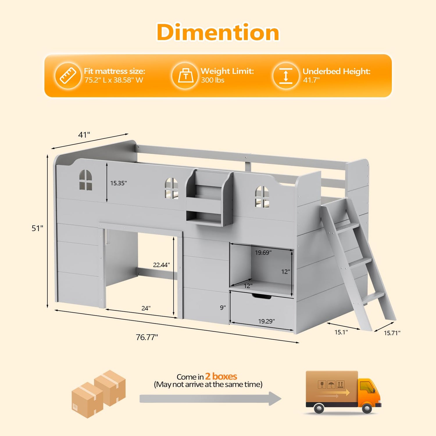 - Superior Quality: This kids loft bed twin is made of solid pine, particle board, plywood side rails and slats, which is durable, non-toxic, low VOC finish. Feature sturdy and stable loft bed frame, 300-pound resting weight capacity per sleeping surface. Come with 2 packages