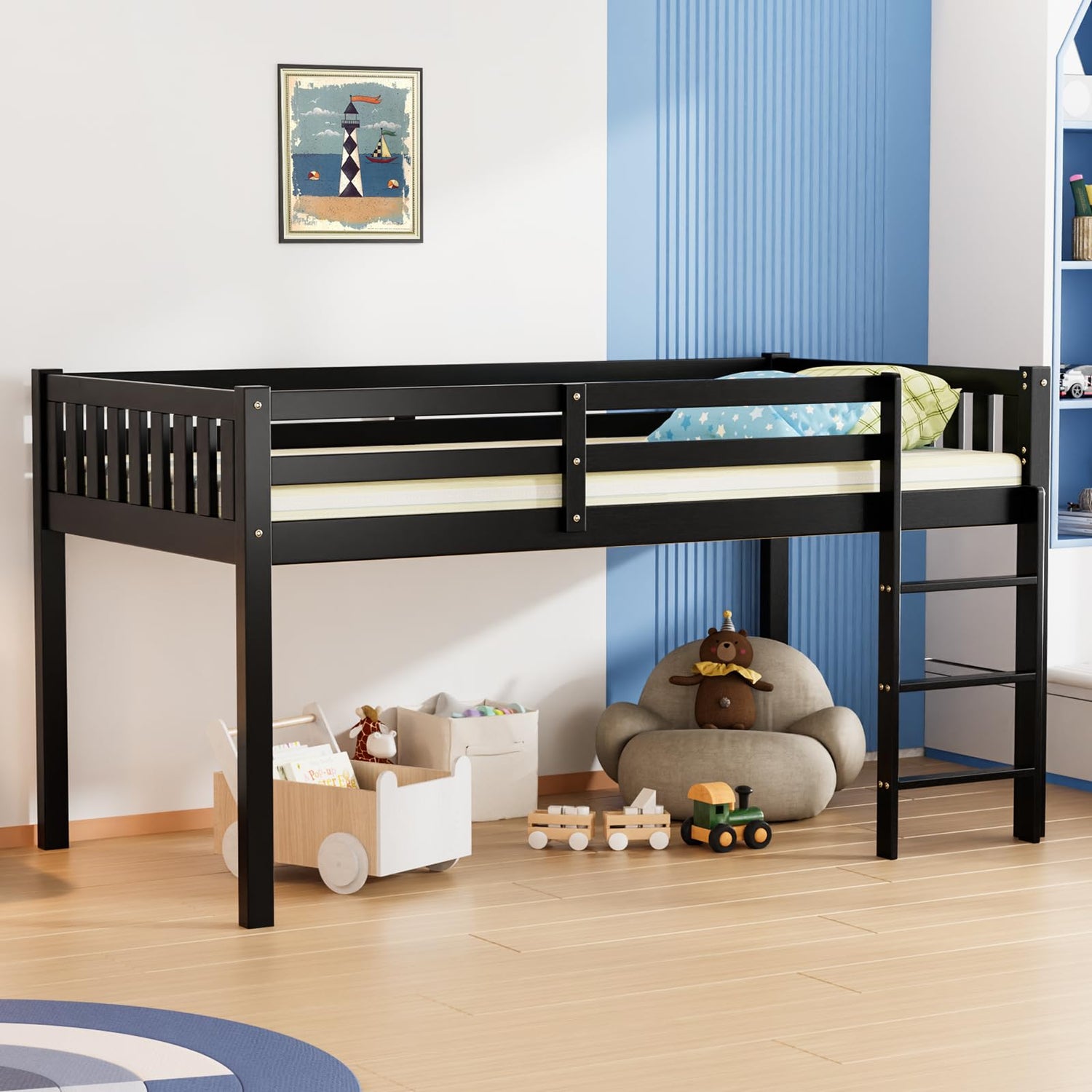 JOYMOR Twin Loft Bed Low Loft Bed Frame for Little Kids Small Room/Low Ceiling Bedrrom with Guardrail and Ladder (Black)