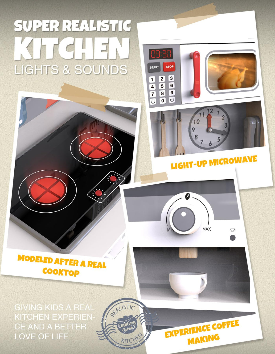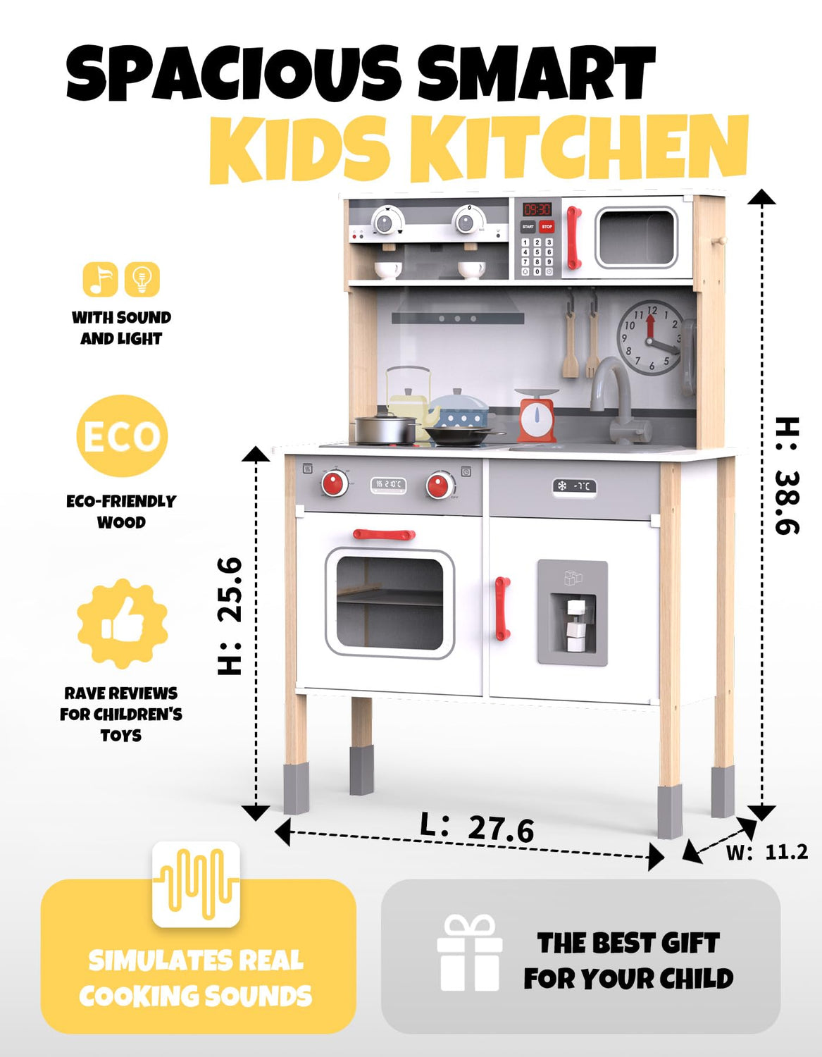 - All Set for Fun: This latest smart kids play kitchen features sound and light effects, complete with an oven, an ice maker that drops ice into cups, a stove with sound and light, a wall-mounted phone, a coffee maker, a sink, and cabinets. This uniquely designed wooden play kitchen set makes a perfect gift for kids' birthdays and Christmas. It's a popular choice for kids kitchen—both stylish and fun!