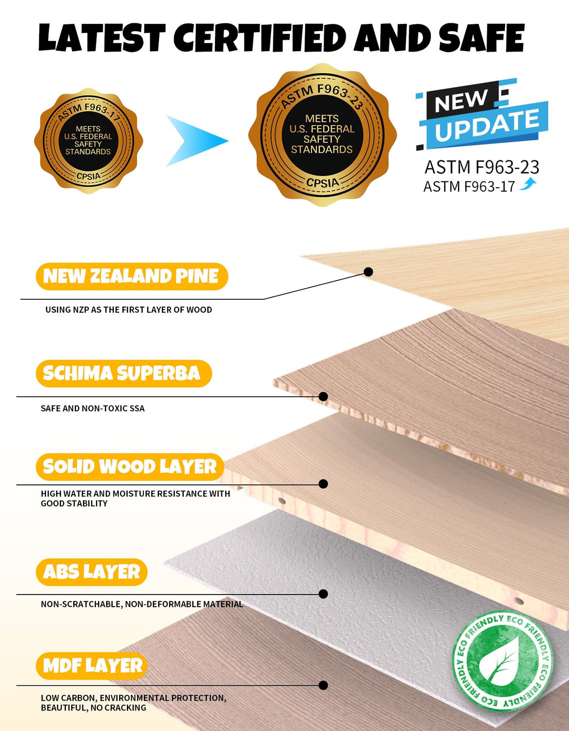 - CARE ABOUT QUALITY: We have strict requirements for all wood we use, No BPA added, non-toxic painting. Passed physical and chemical safety tests far beyond the ASTMF-963-23standards. Because it matters to kids' health.