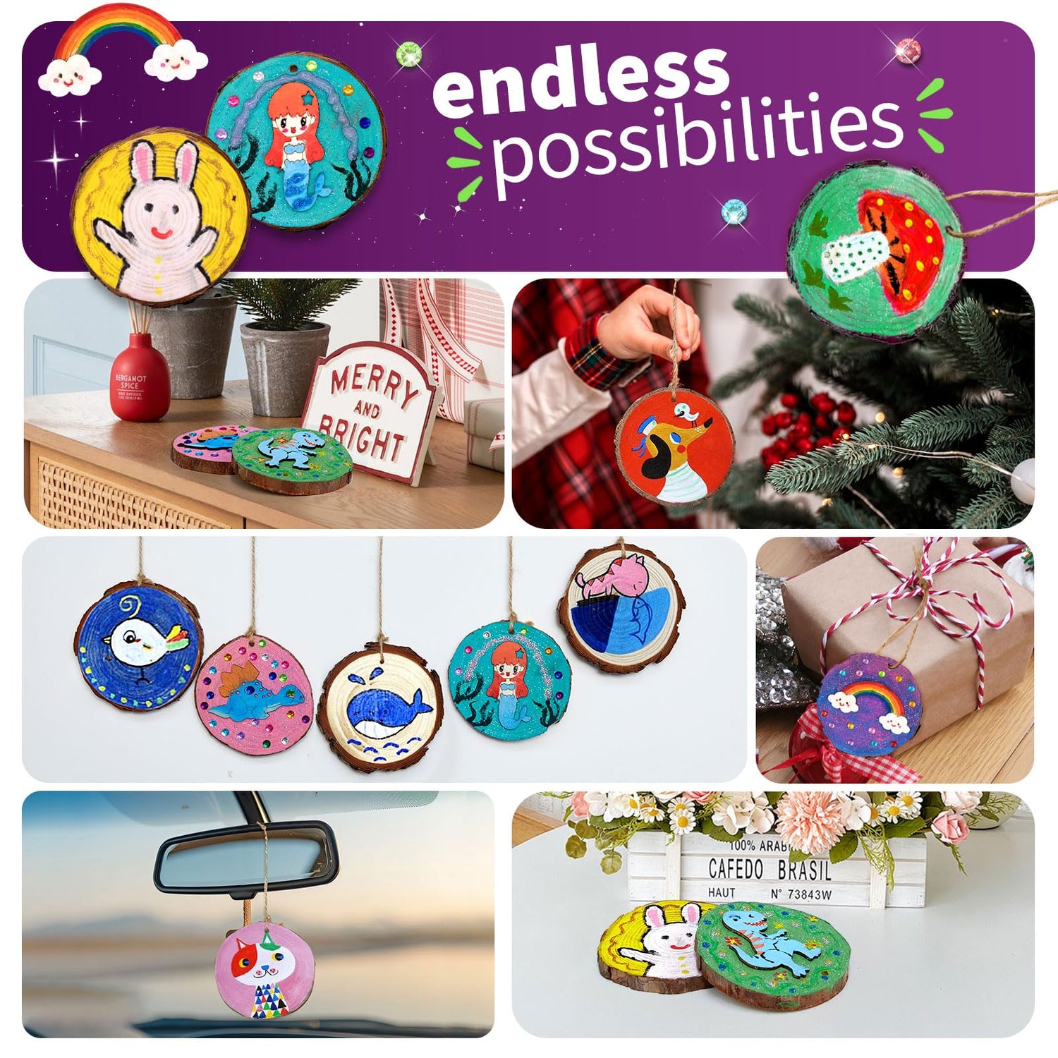 - Reusable : Wood slices can be used over and over again, just cover off the previous painting with a light color and then kids can paint over it!