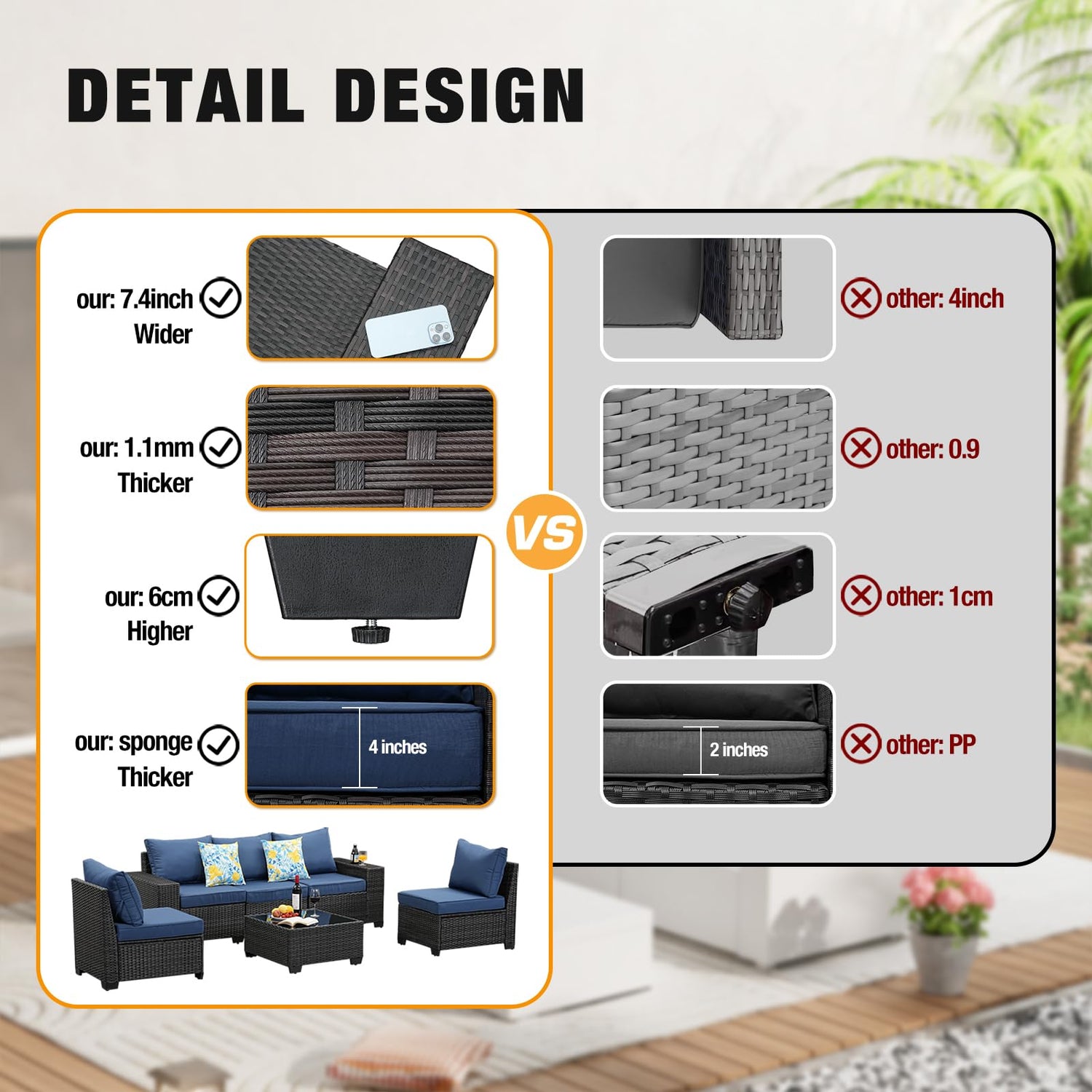 - DURABLE MATERIAL: JOYURE rattan patio furniture set is made of brown PE rattan which is hand-woven and strong steel frame, It is durable enough to withstand rain and wind for long time using. the powder coated steel frame inside the sofas makes sofa sturdy