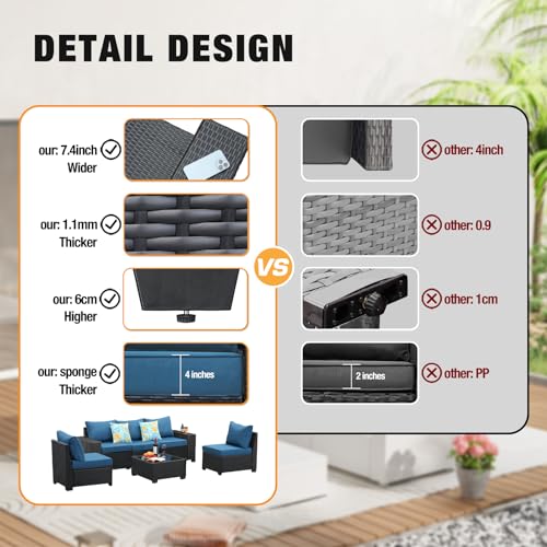 JOYURE 6 Pieces Patio Furniture set All-Weather Outdoor Wicker Sectional Conversation Sofa Rattan patio seating sofa with cushion and Glass Table for Porch Poolside,Peacock Blue