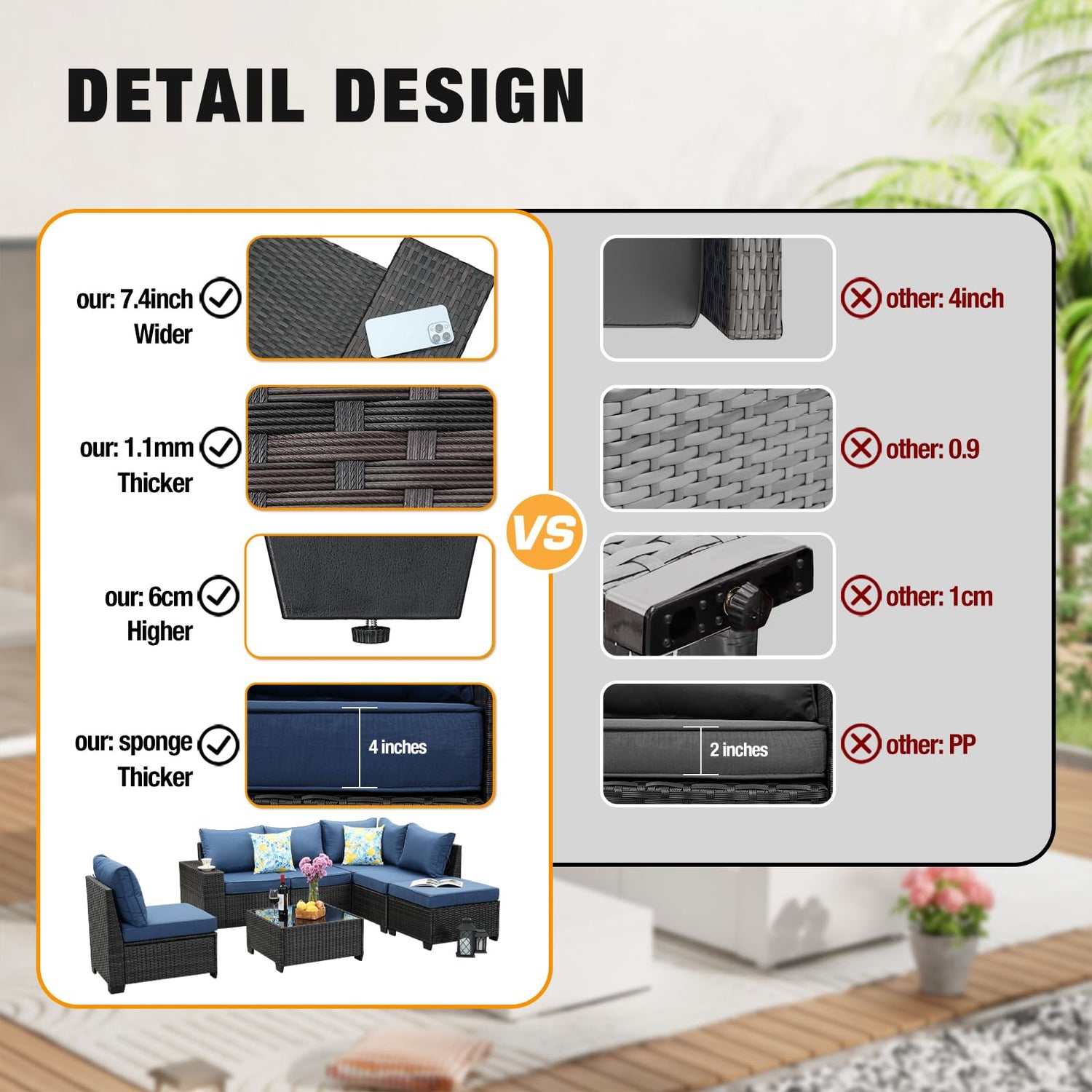 JOYURE 7 Pieces Patio Furniture Set All-Weather Outdoor Wicker Sectional Conversation Sofa Rattan Patio Seating Sofa with Cushion and Glass Table and Ottoman for Porch Poolside,Navy