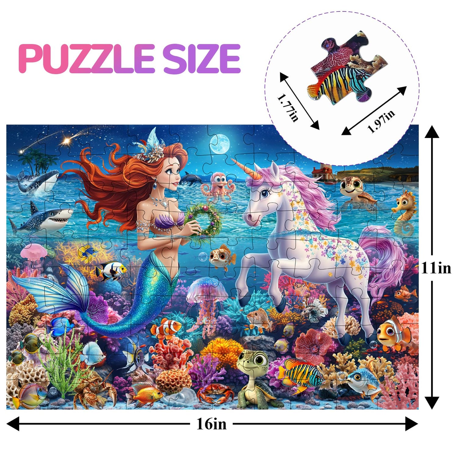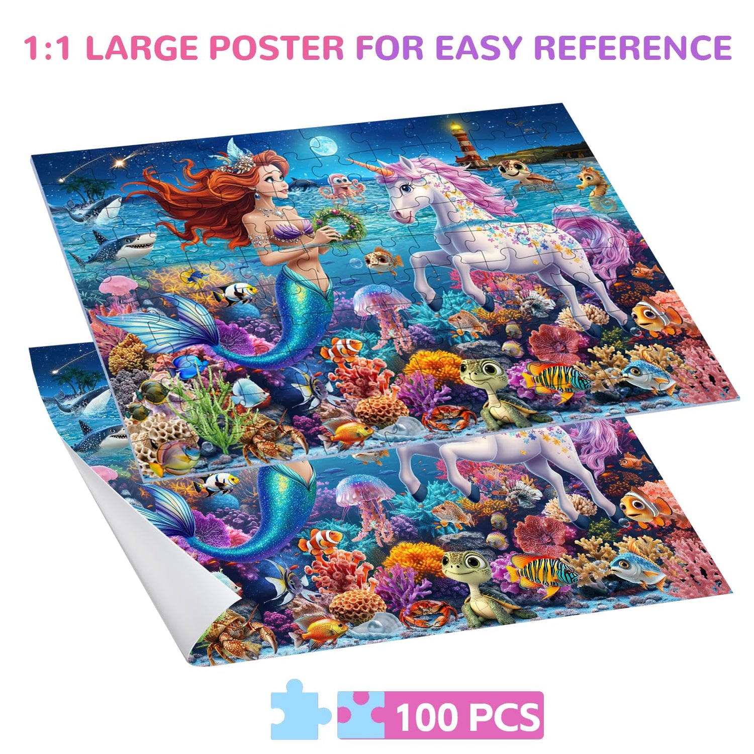 - 100Pcs Puzzle: Our mermaid and unicorn puzzle for girls 4-6-8-10, combines fantasy elements like mermaid and unicorn with realistic marine life to spark imagination and learning