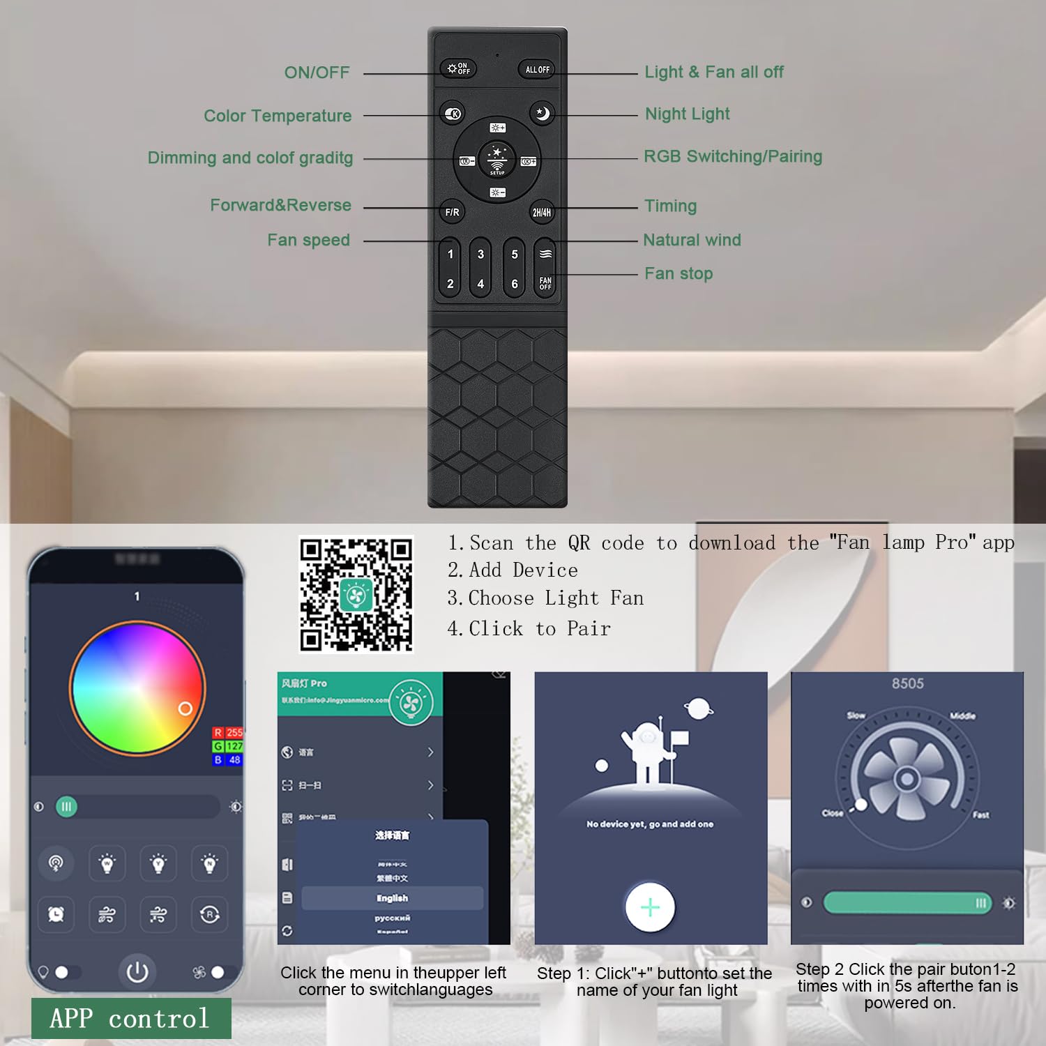 - 【Adjustable RGB Lighting Ceiling Fan with Ligh】: The ceiling fan light features tri-color LED lights and ring RGB ambient lighting, which can be independently controlled via a remote control or app,Our smart ceiling fan light can be adjusted from 10% to 100% brightness, ensuring you find the ideal lighting for any occasion. You can select from 3000K warm white, 4000K natural white, and 6000K cool white color temperatures, along with 8 different RGB brightness modes suitable for various Scenarios in your home.