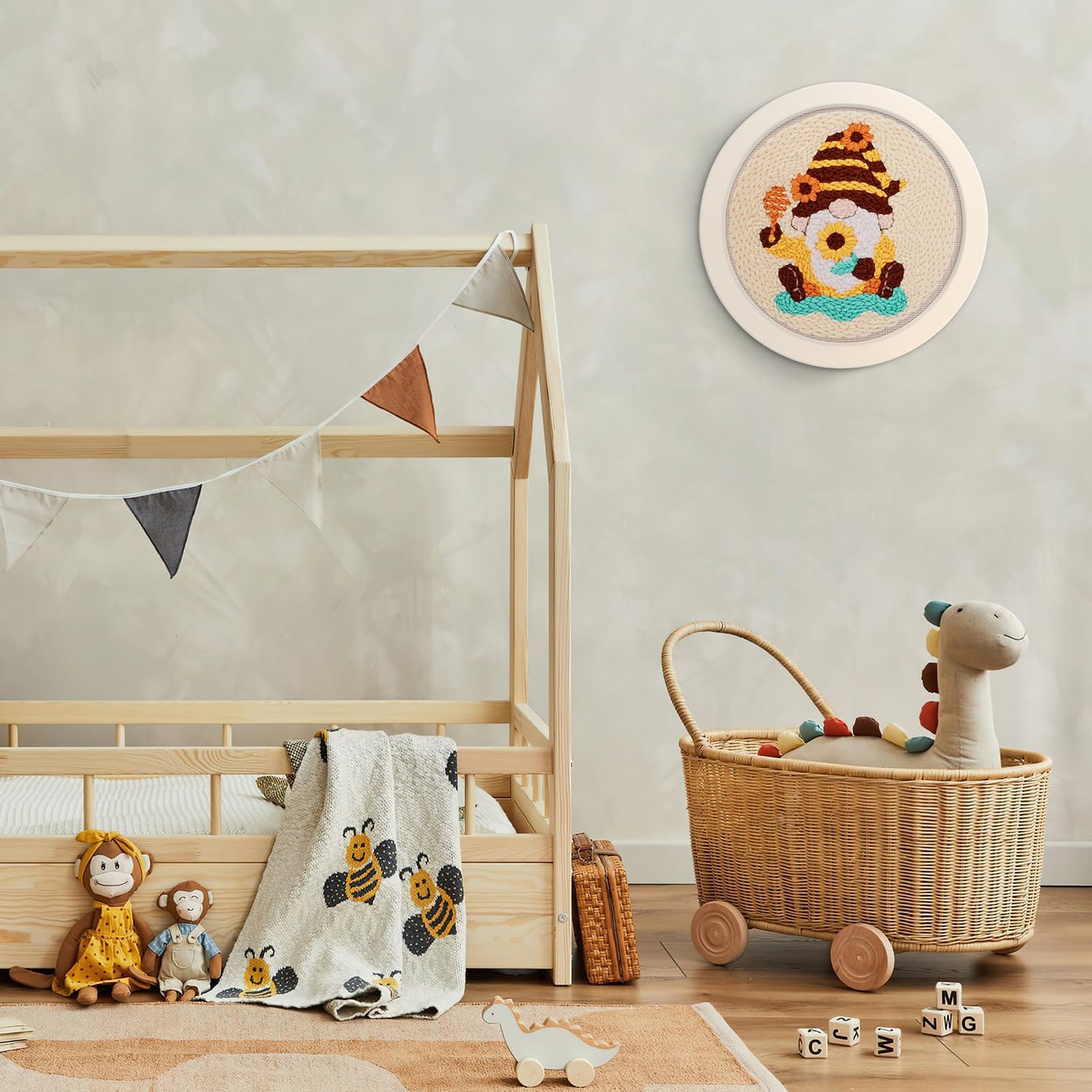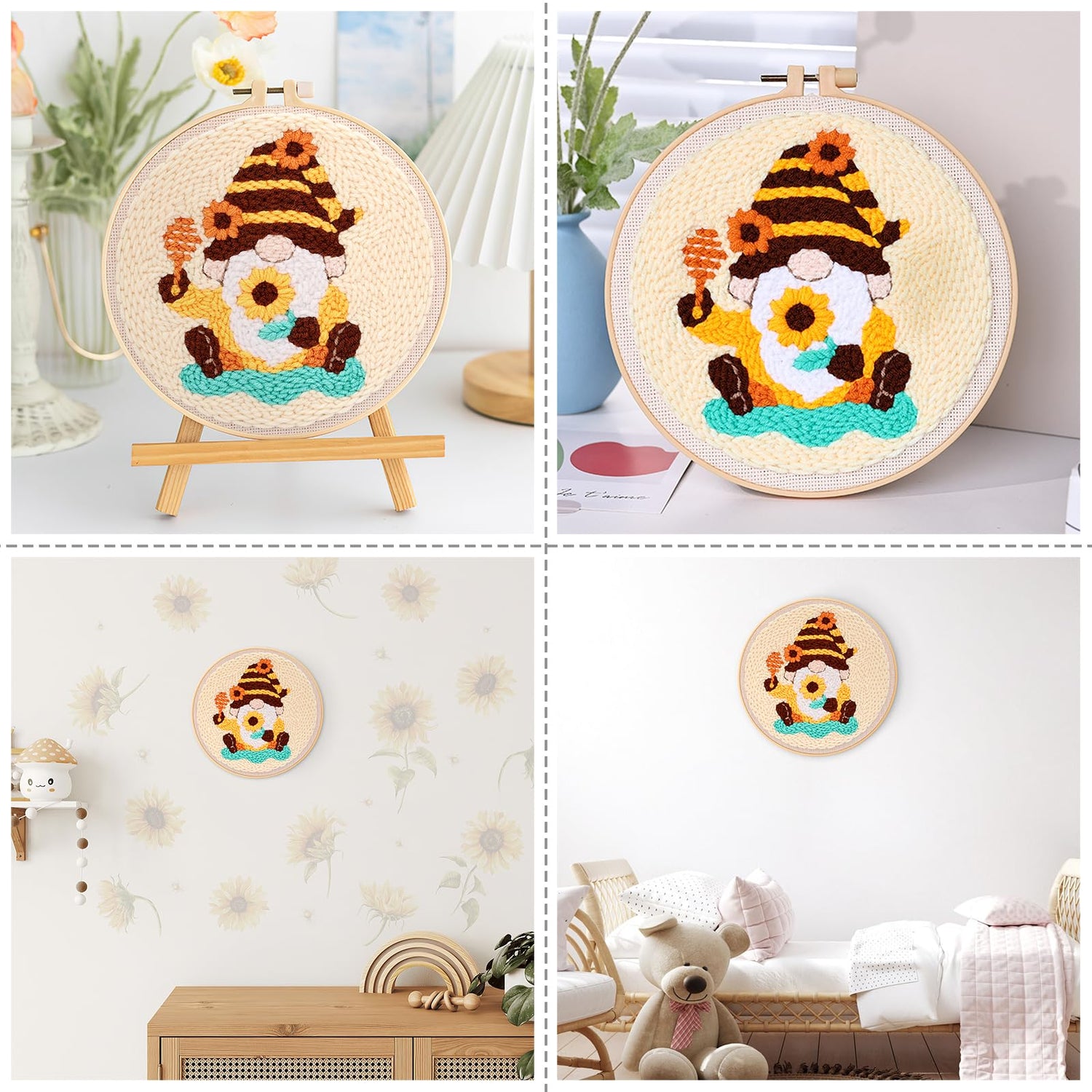 - Cute honey gnome design: The punch needle embroidery kit features a design of honey sticks, gnomes and sunflower, delicate and adorable, loved by both adults and kids. The motifs are pre-printed on the embroidery fabric, so please avoid contact with water before completing the embroidery process
