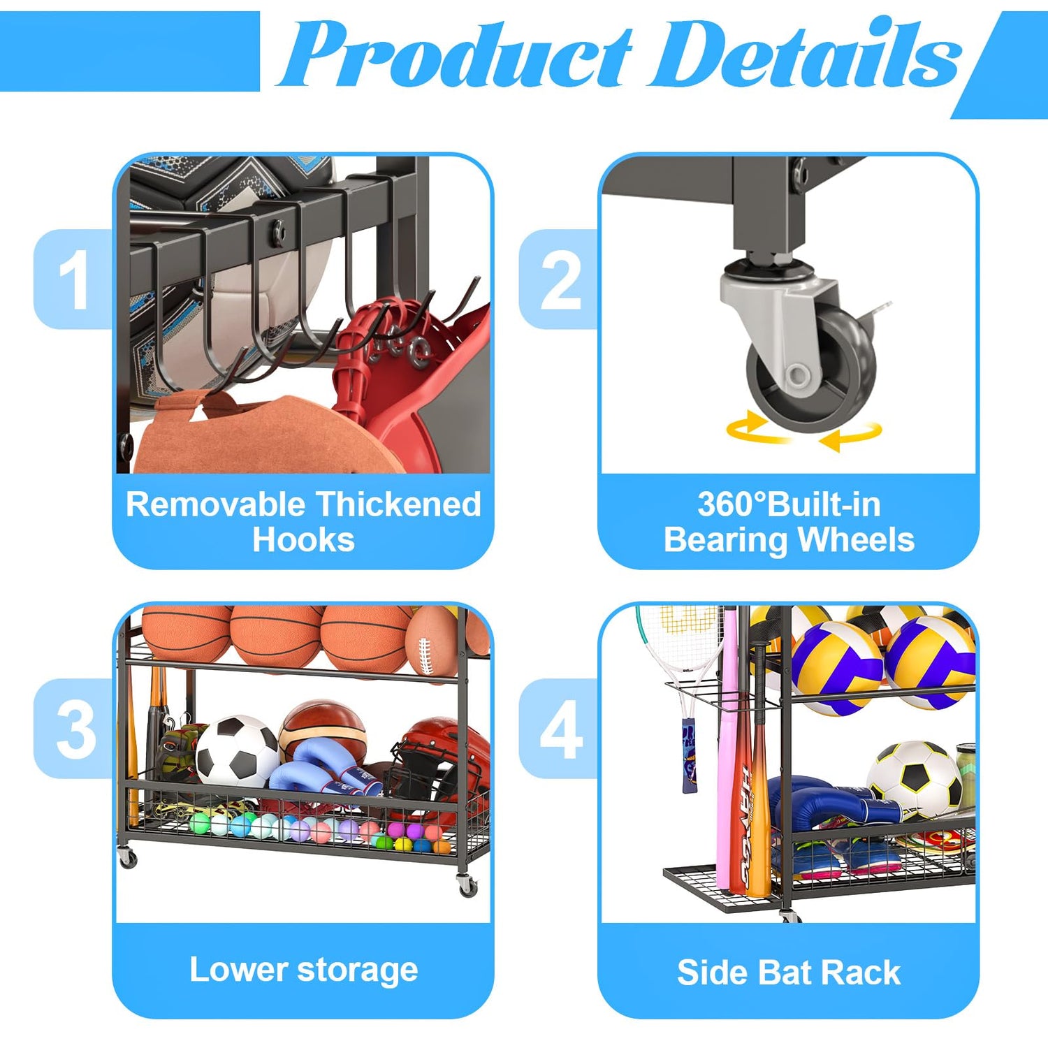Jsskeeim Garage Sports Equipment Storage Rack,Wheeled Sports Ball Storage Bin,Garage Sports Equipment Organizer,Ball Organizer Toy Organizer with Baseball Bat Holder and Hooks-Black