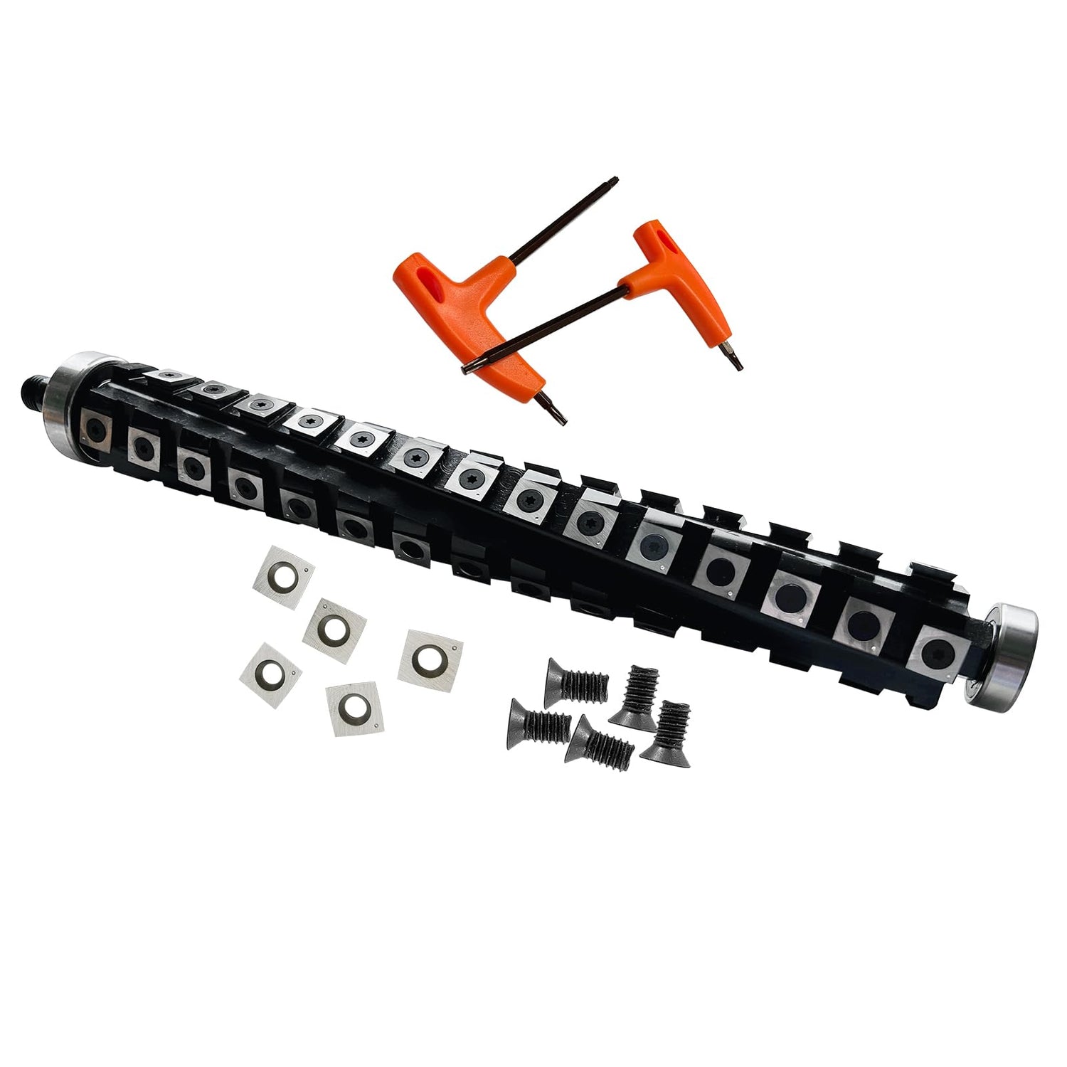 - Including: 13-Inch Cutterhead (Bearings Pre-Installed), 61PC carbide inserts(SIZE:15x15x2.5mm-30°-R150), 61PC screws, two T wrenches