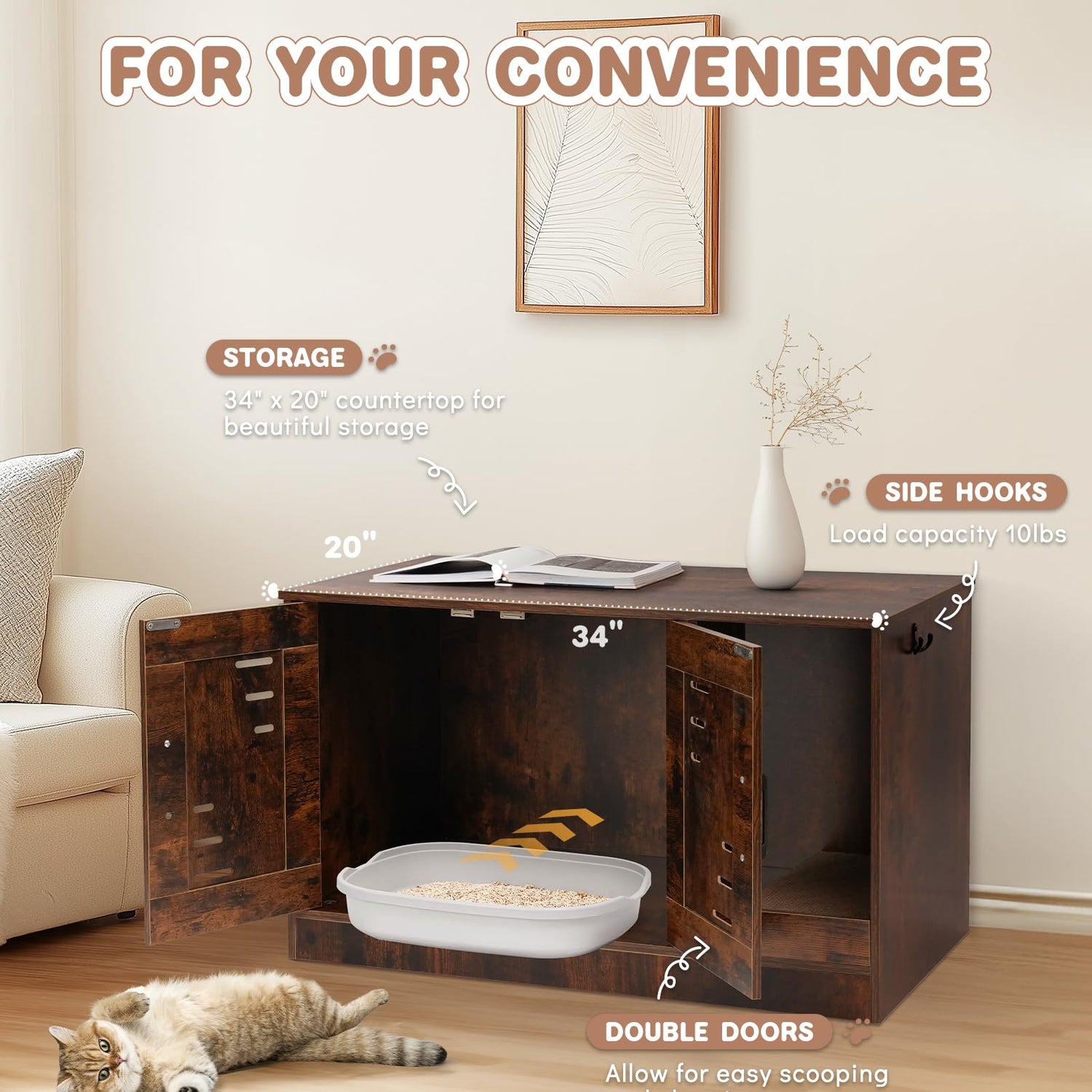 - MULTIFUNCTIONAL CAT HOUSE WITH COUNTERTOP: With a spacious 34"x20"countertop, load capacity 75lbs, The cat litter box enclosure suitable for a variety of decorative storage items, such as vases, lamps, books or your favorite collection of small items. This cat litter box enclosure is very versatile and can be used as a pet house, storage cabinet, nightstand, or entryway bench.