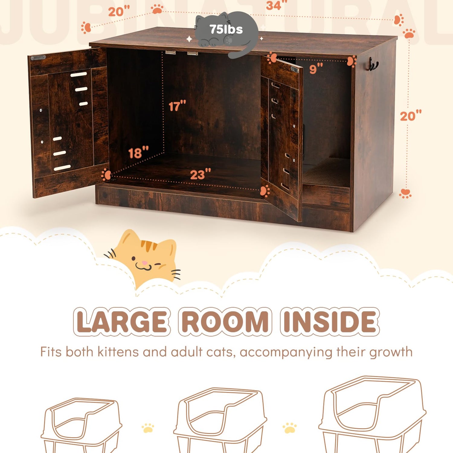 JubiNatural Cat Litter Box Enclosure, Hidden Cat Litter Box Furniture with Vent and Scratch Pad, Enclosed Odor Control, Easy Clean Panel, for Bedroom, Living Room, Rustic Brown
