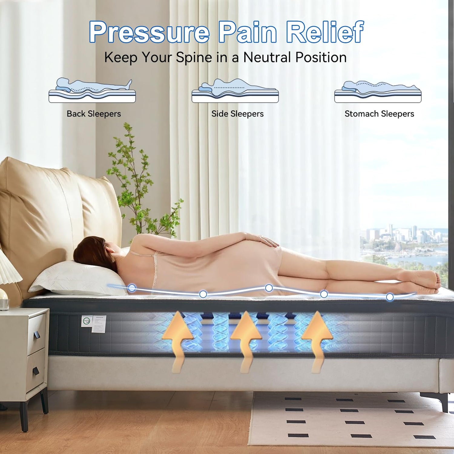 - Thickened Memory Foam Hybrid Mattress: Our Thickened Memory Foam Mattress Is Designed To Support Your Body And Relieve Pressure Points, The Hybrid Mattress Is Ergonomically Designed To Reduce Pressure On The Spine, Allowing You To Sleep Soundly In Luxurious Comfort Whether You Sleep On Your Back, Side Or Stomach.
