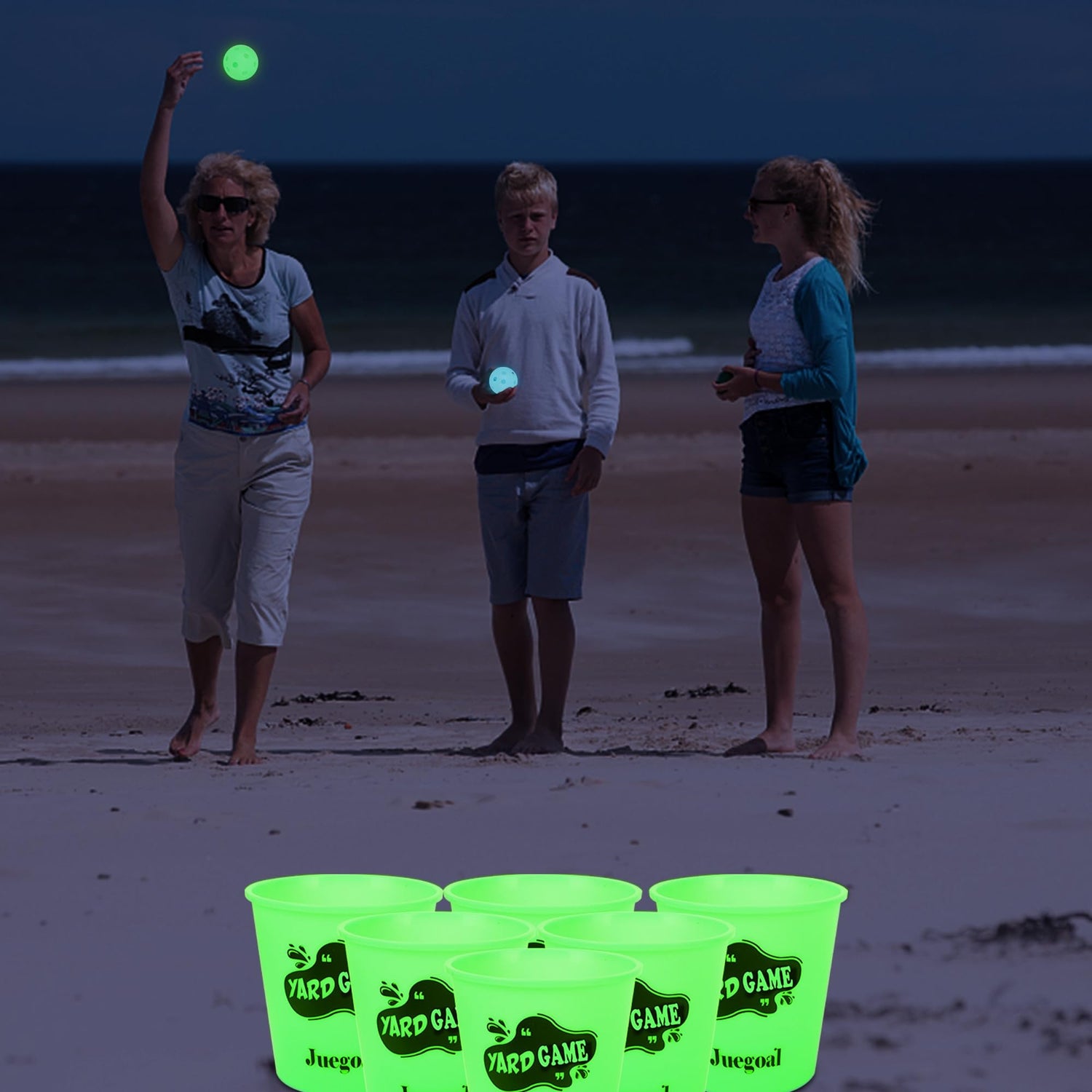 - OUTDOOR GLOW IN DARK GAME SET: Includes 12 plastic buckets glow in the dark, 6 balls glow in the dark ¨C2 yellow hollow balls, 2 blue hollow balls, 2 green hollow balls, black carry bag & instructions. Easy to understand game play and flexible rules, suitable for all kinds of people, whether children or adults, beginners or advanced players. Enjoy your favorite outdoor toss games!