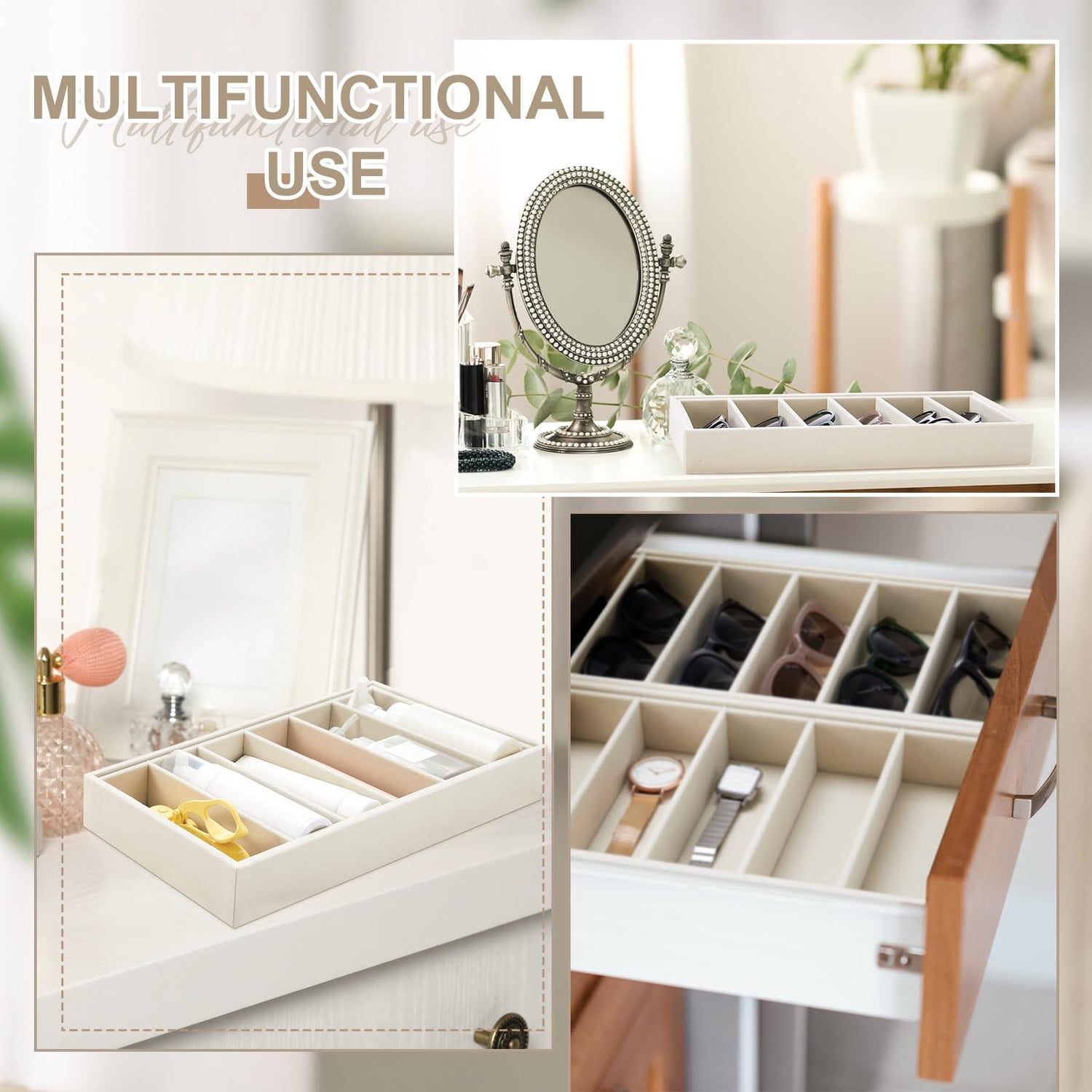 - Versatile Display Utility: this beige velvet glasses organizer does more than holding your glasses; The adjustable partitions can better adapt to your storage needs; You can store various items such as sunglasses, watches, cosmetics, ties and accessories; Therefore offering utility and enhancing your display