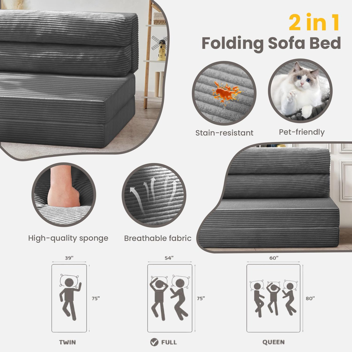 - Luxurious Fabric: This folding sofa bed adopts corduroy fabric, whose soft and elastic characteristics bring customers excellent comfort experience. In addition, the breathability and wear resistance of corduroy ensure the durability and comfort of the sofa bed in daily use, allowing you to relax easily in any occasion.
