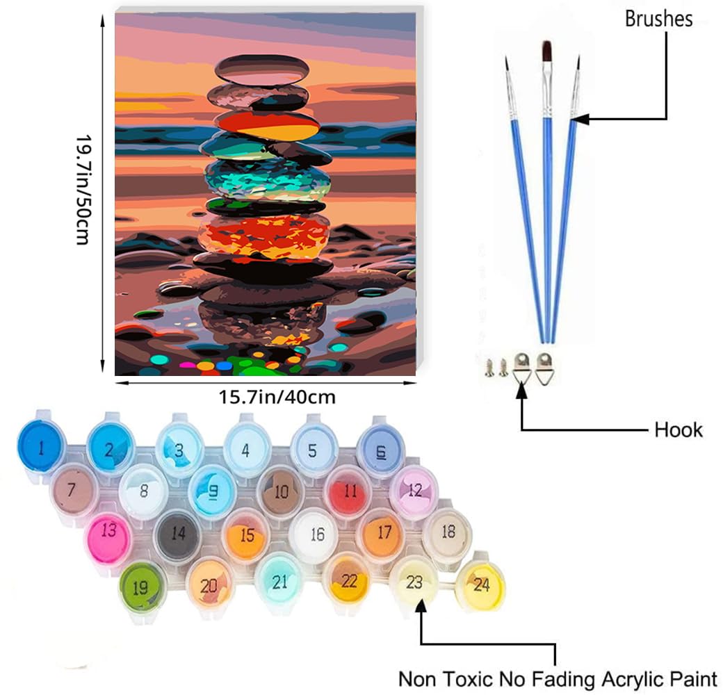 JUJUHOOD Sunset Beach Stone Paint by Numbers Beginner,Beach Scenery Paint by Number Kit for Adults, Adult Paint by Number Canvas with Paintbrushes and Acrylic Pigment16x20 inch,Sunset Beach Stone