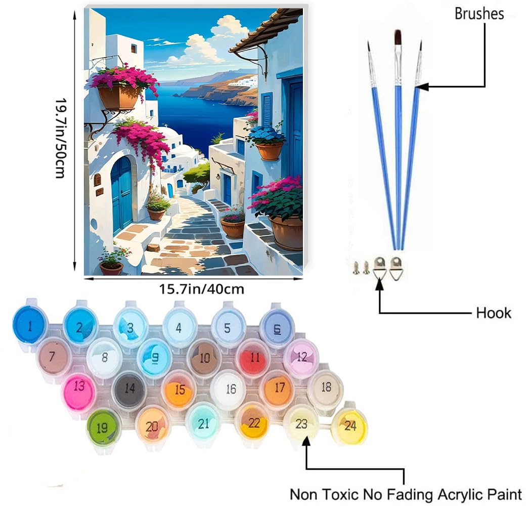 JUJUHOOD Sunset Santorini Paint by Numbers Kit for Adults,Landscape Adult Paint by Number Kits,Adult Paint by Number Canvas with Paintbrushes and Acrylic Pigment 16x20 inch