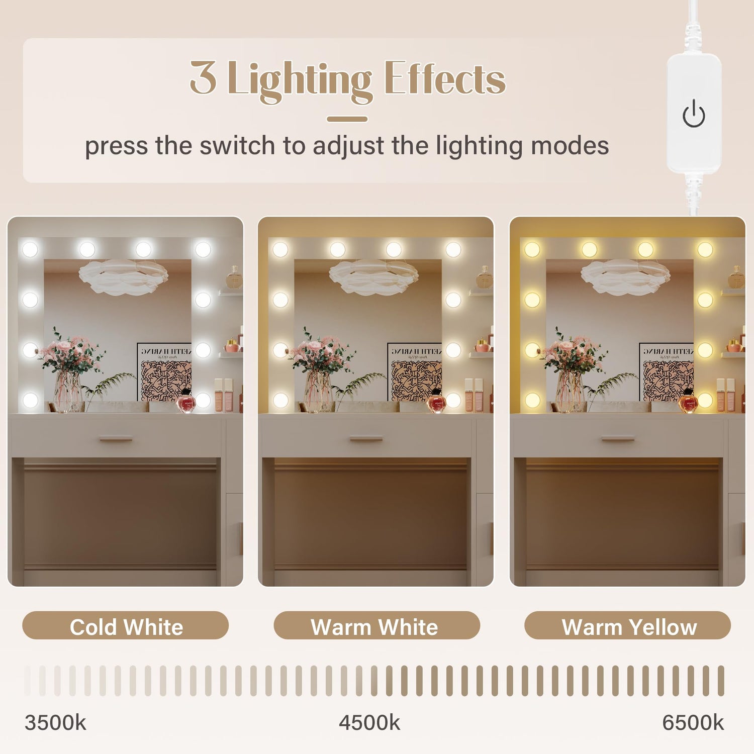 - Professinonal Tri-Color Beauty Lighting System This dresser is equipped with 10 LED bulbs, providing three professional makeup light sources: natural light/warm light/cold light, with a stable series circuit design and 2 spare bulbs included, to ensure that the light will always be even and bright when used for a long period of time, so as to bring out the most realistic effect of makeup.