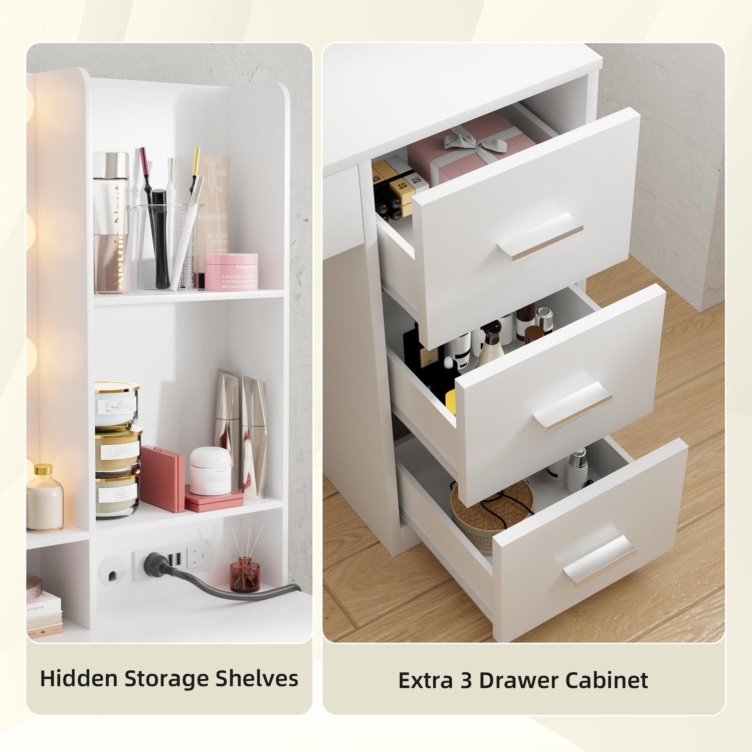 - Big Drawer&Open Shelves: Providing large storage space for our beautiful girls and women is our original intention of this vanity. Our vanity table contains 4 large drawers(1 long drawer and 3 side drawer) and 3 open display shelves, in which you can store all your cosmetics and skincare products, easily get them whenever you want. Meanwhile, a hair dyer rack is ready for you.