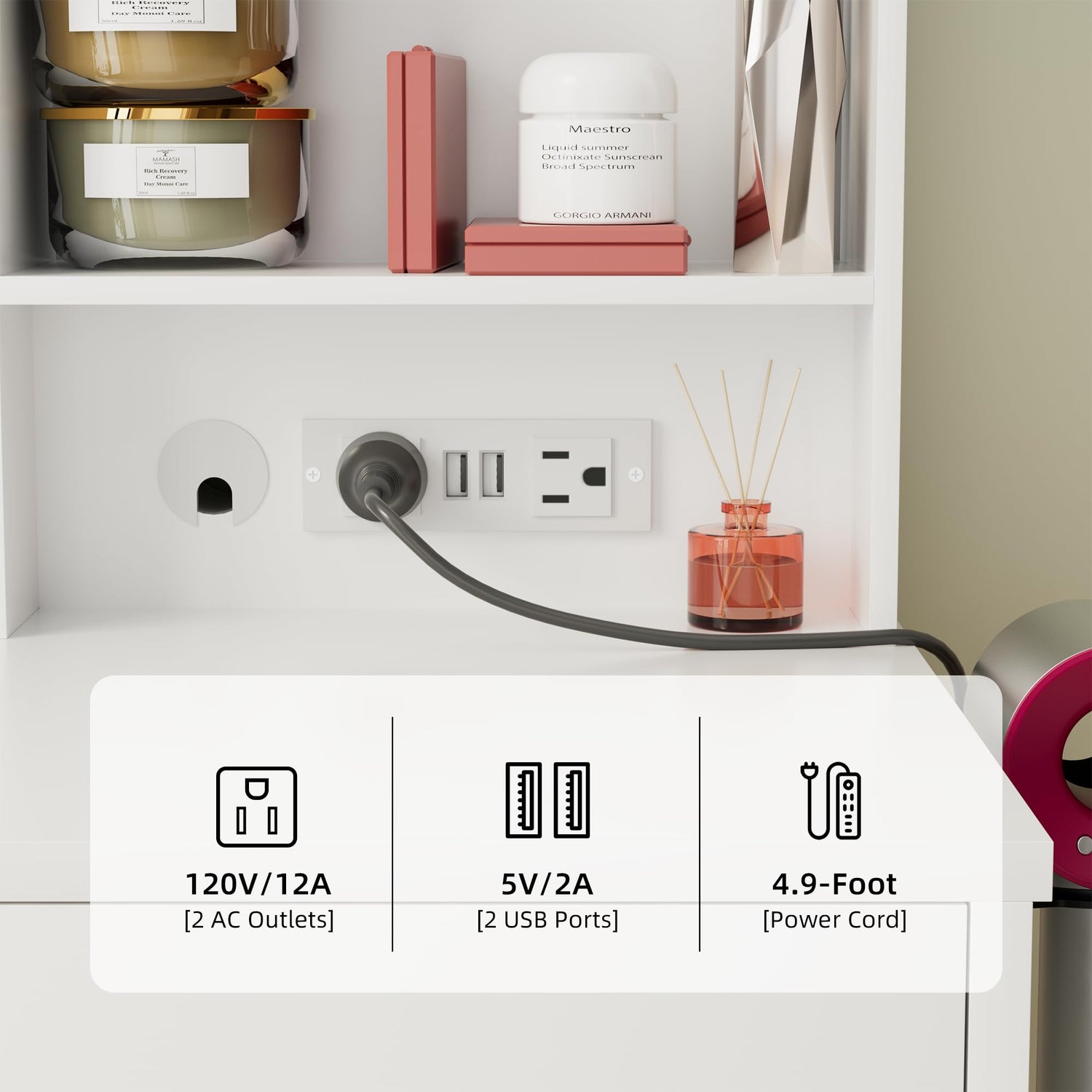 Power socket and USB ports for hair dryer and curling iron