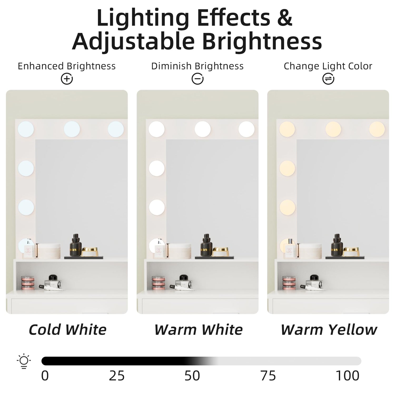 - Makeup Mirror with 10 Dimmable Bulbs: The clear mirror with 10 adjustable bulbs is a great helper for makeup. Change the model or brightness you need, cold white, warm white or warm yellow. With suitable lights, you can show your beauty or style to your heart’s content, get beautiful or unique photos for yourself.