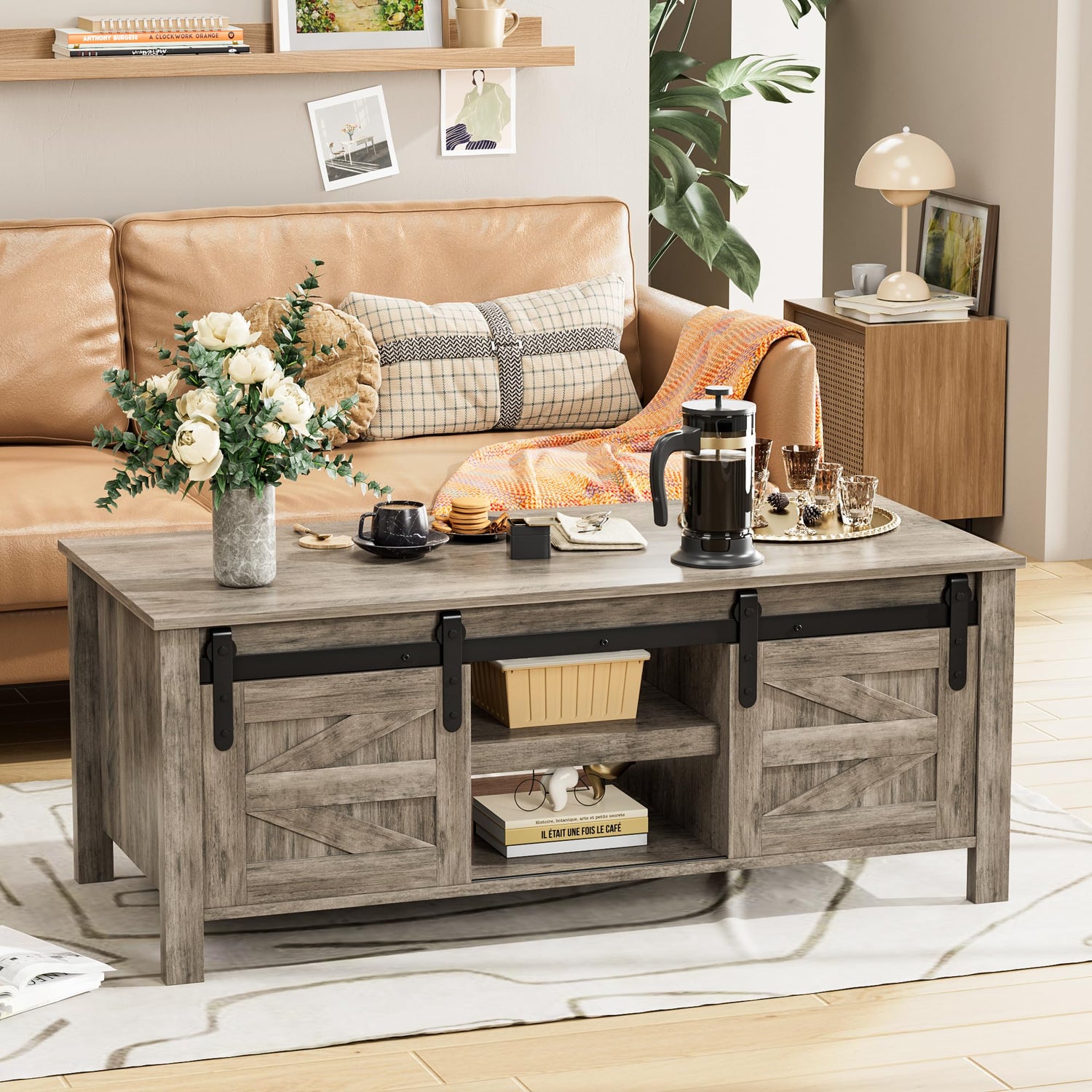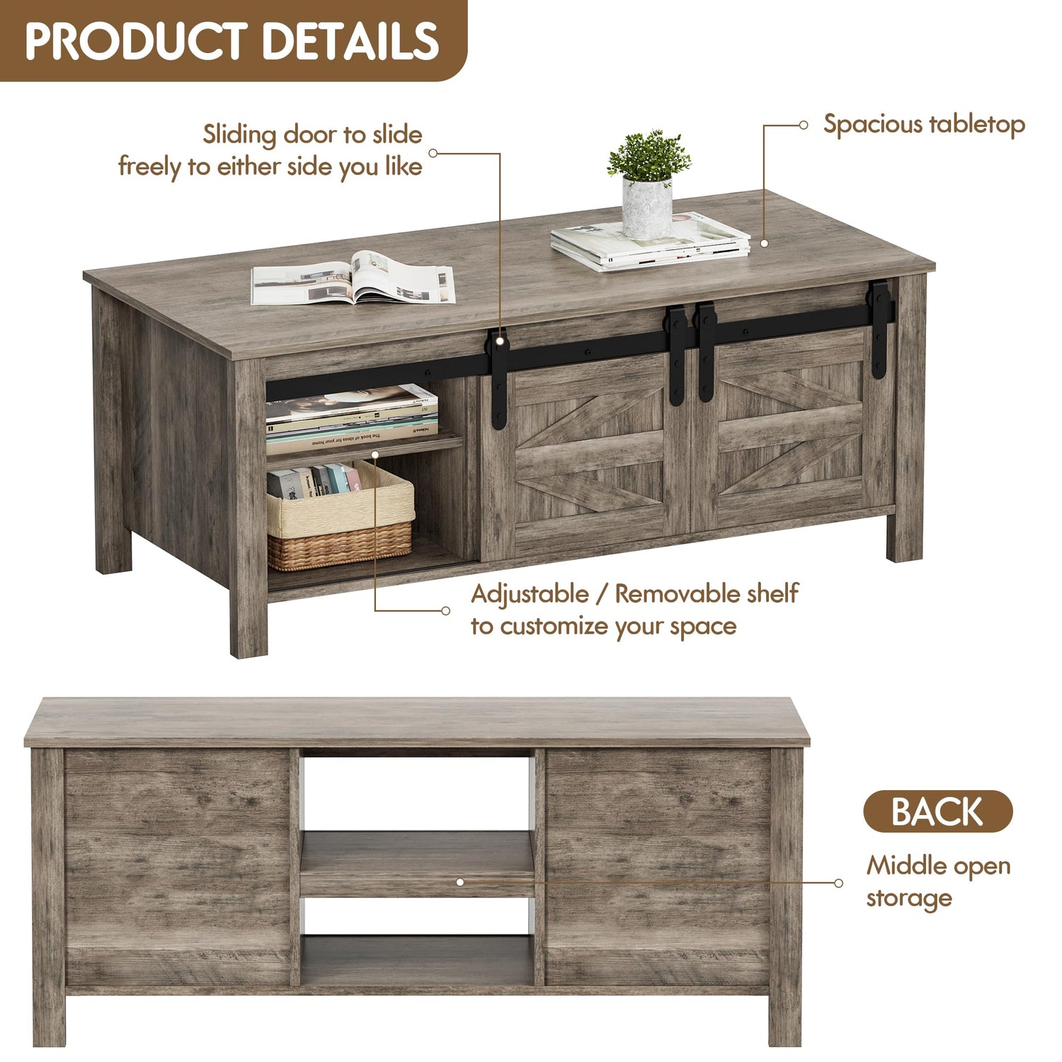 The farmhouse-style coffee table is made of high-quality MDF material and metal corners. 1 large spacious table top, 2 open adjustable position storage shelves and 4 hided storage cabinets and two sliding barn doors provide ample storage space for your living room items. And add a retro and mysterious touch to your room.