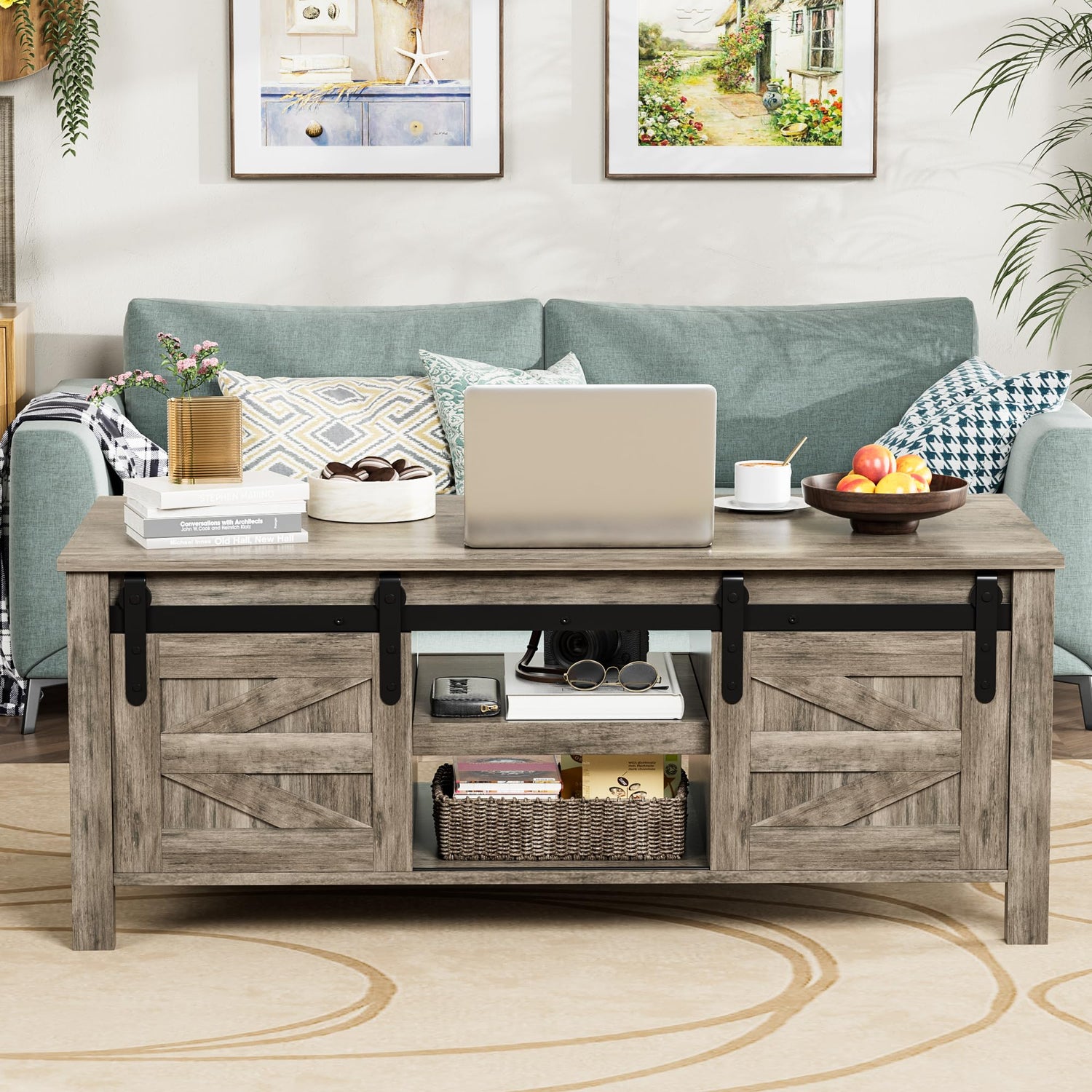 JUMMICO Farmhouse Coffee Table with Storage & Sliding Barn Doors, Modern Rustic Living Room Table with Adjustable Shelves, Wooden Rustic Center Table for Living Room (Light Rustic Oak)