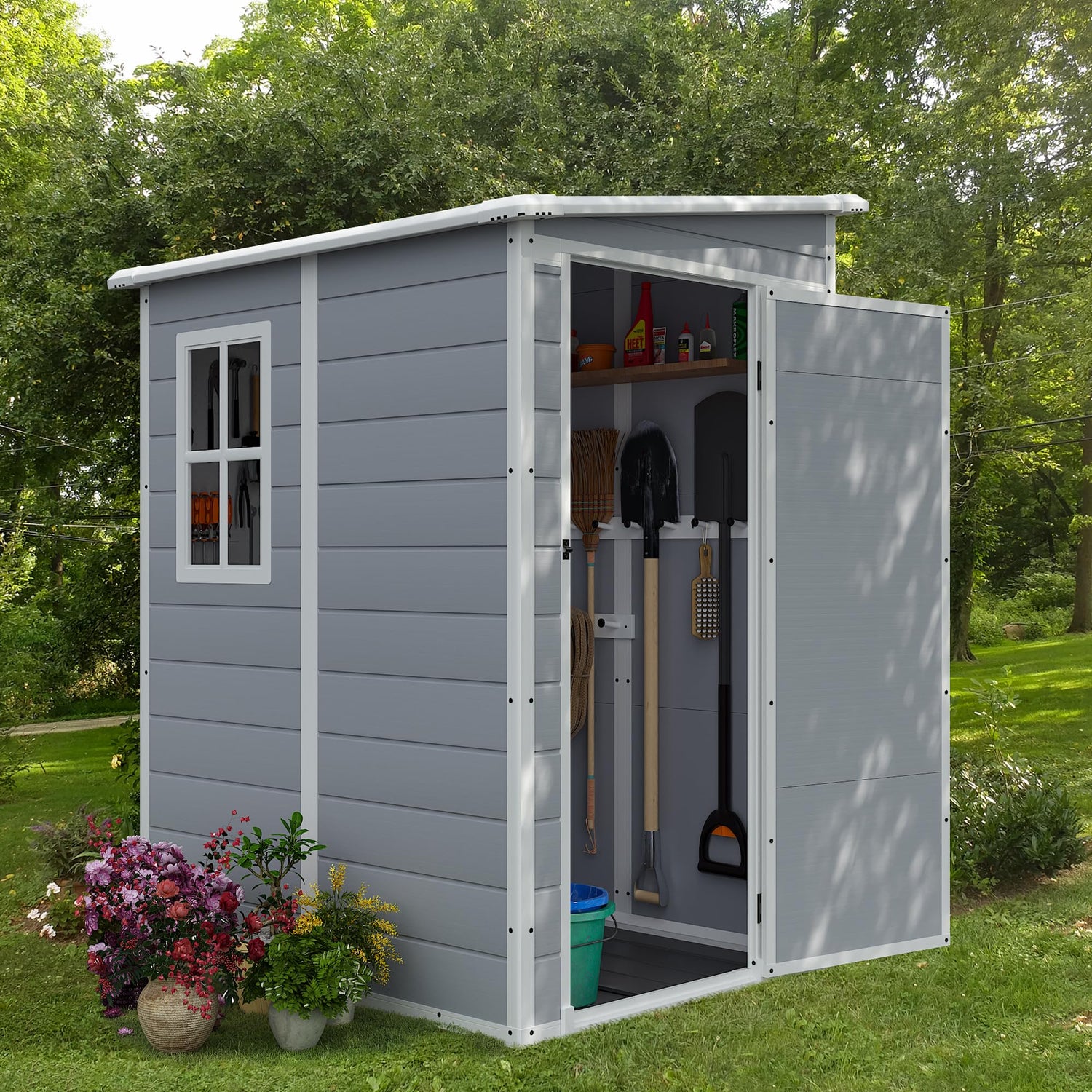 - WORRY-FREE USE: The resin storage shed features a lean-to roof, which prevents water and snow accumulation and increase the space inside the shed. Side window provides ample light to make all contents visible during the day. The door with lockable design ensures security.